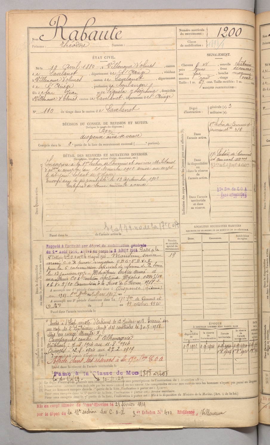 | Rabaute | Théodore | FOIX | 129 W 4 | 1900 | Villeneuve-d'Olmes | Villeneuve-d'Olmes | 1200 |