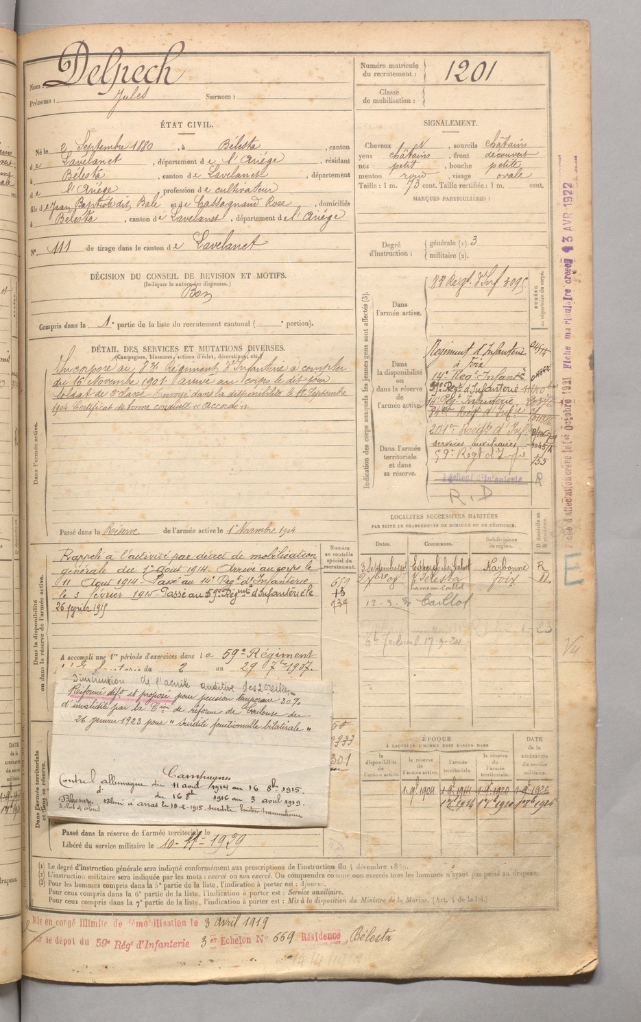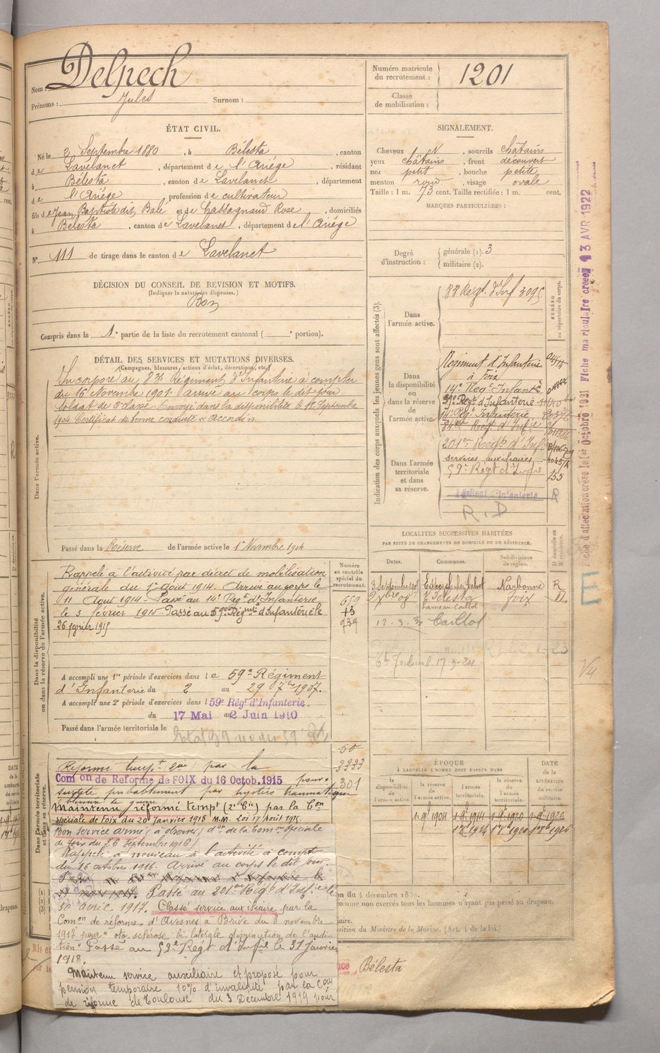| Delpech | Jules | FOIX | 129 W 4 | 1900 | Bélesta | Bélesta | 1201 |