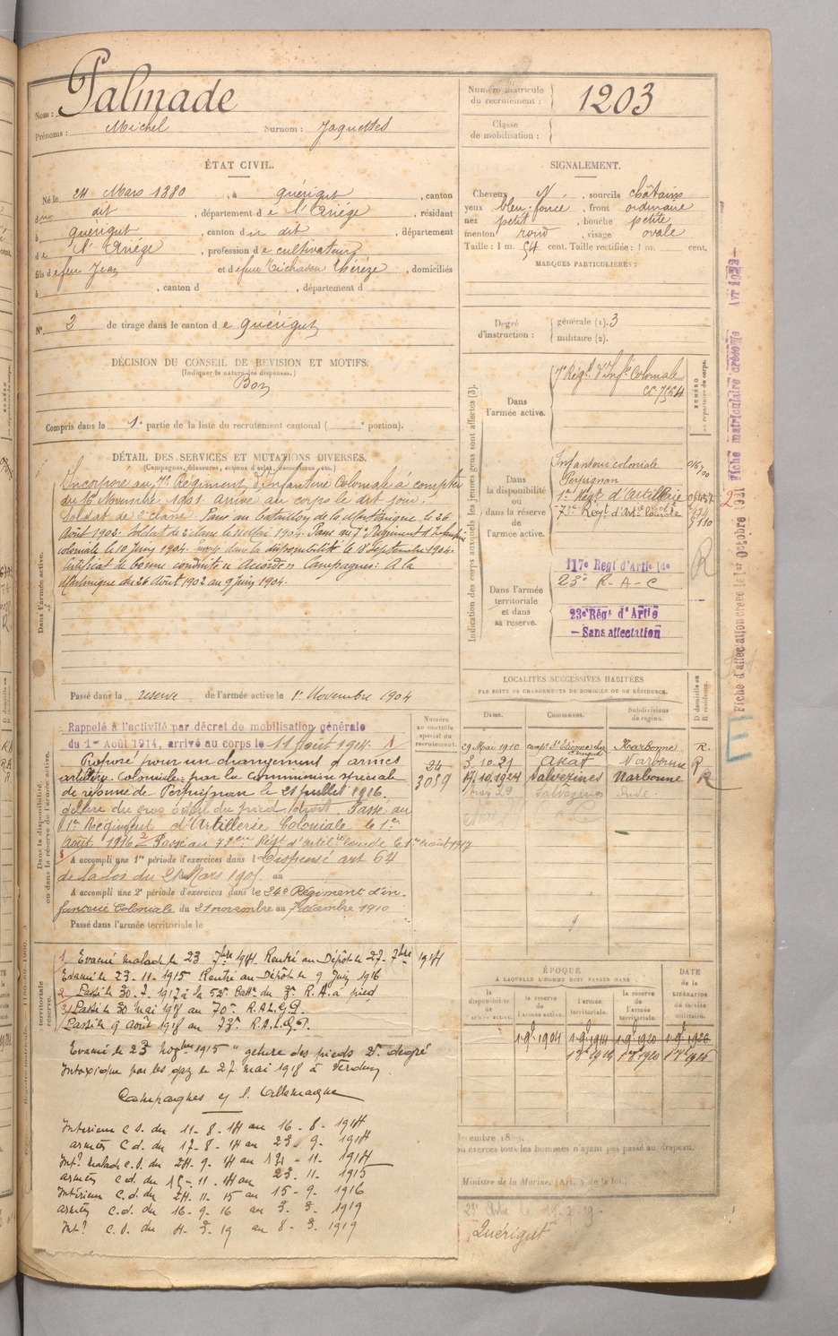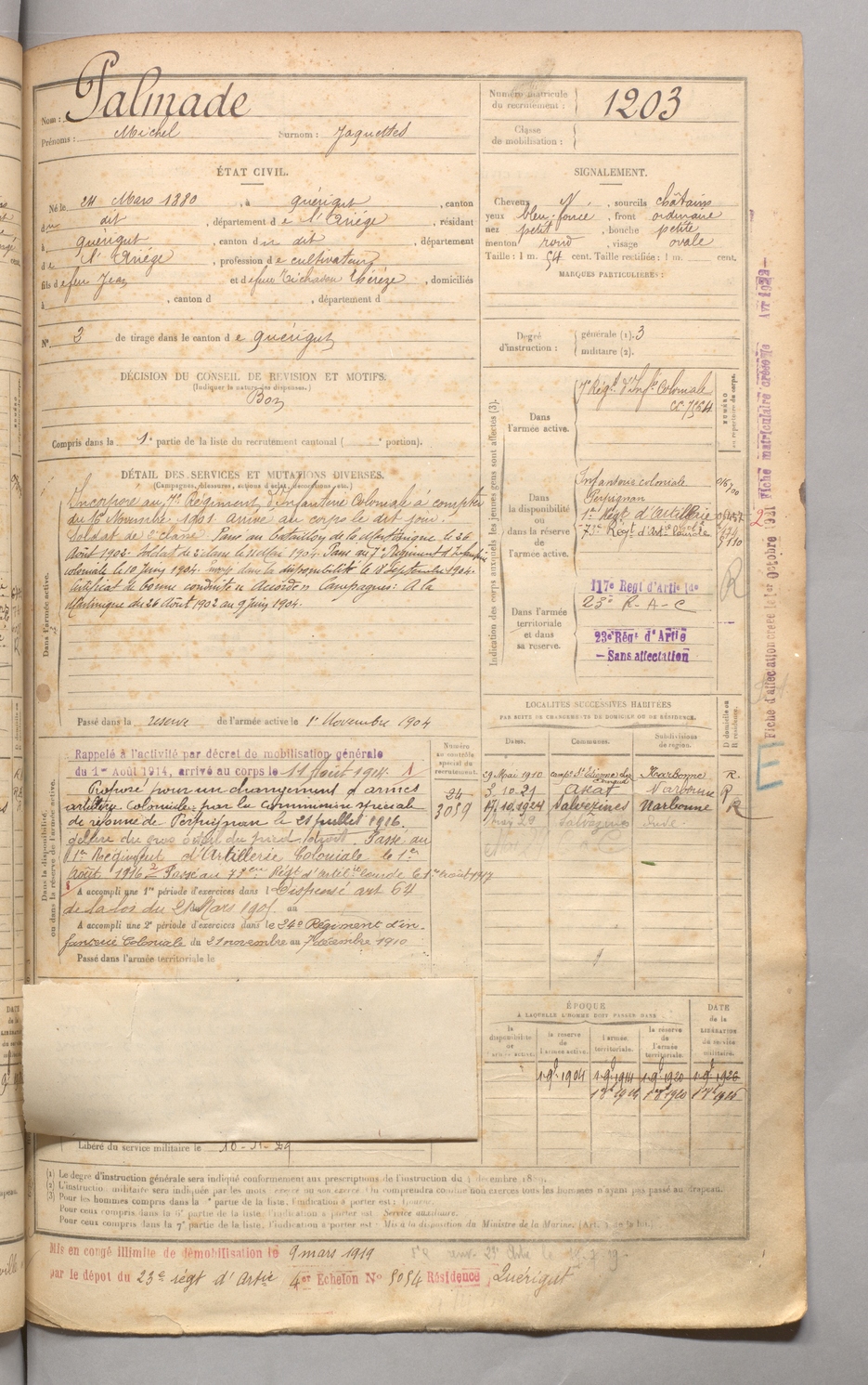 | Palmade | Michel dit Jaquettes | FOIX | 129 W 4 | 1900 | Quérigut | Quérigut | 1203 |