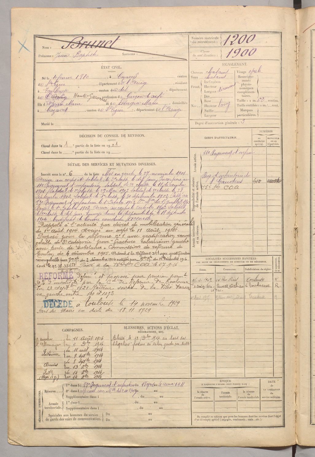 | Brunet | Jean Baptiste | FOIX | 129 W 5 | 1900 | Cazavet | Toulouse | 1200 |