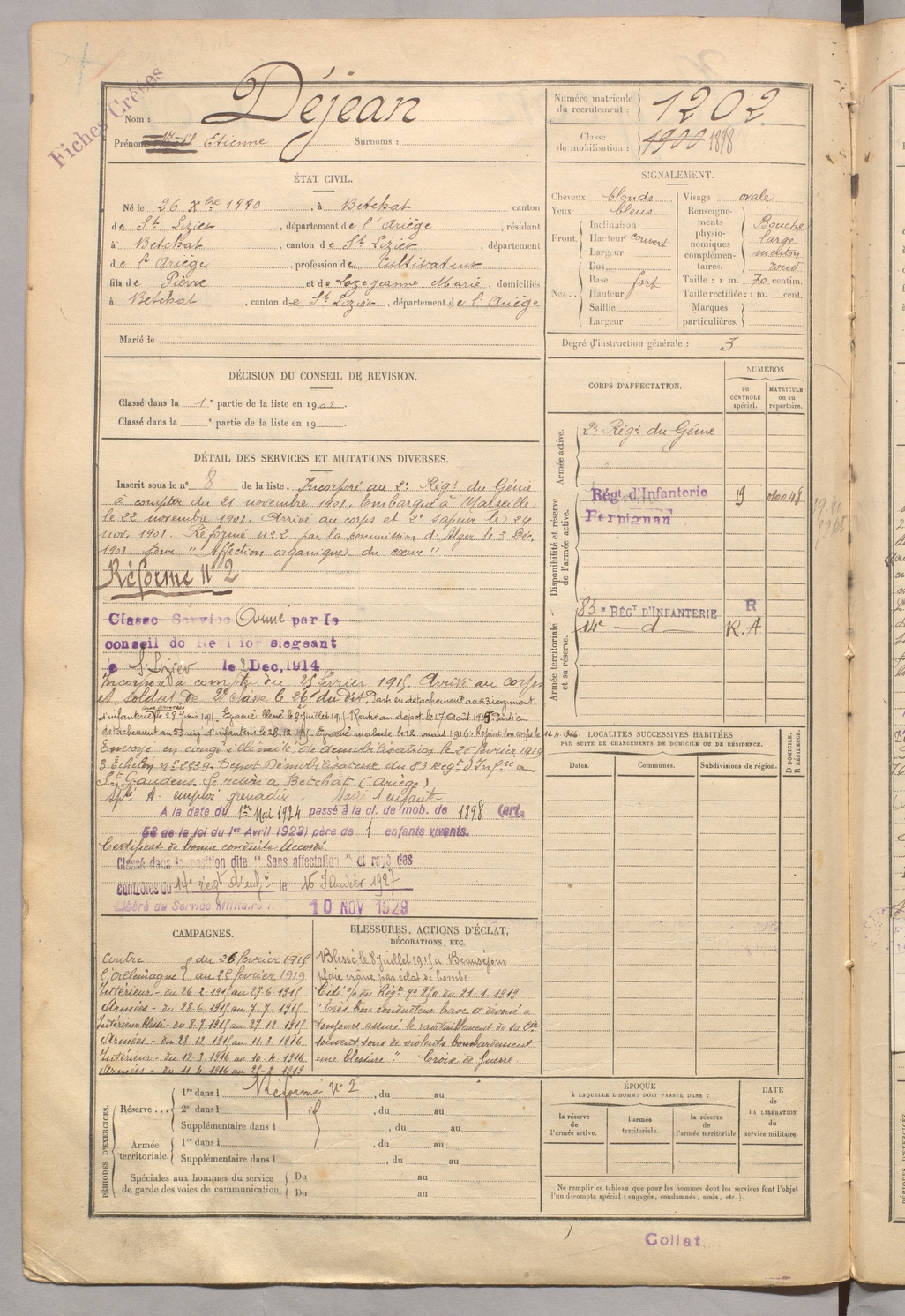 | Déjean | Etienne | FOIX | 129 W 5 | 1900 | Betchat | Betchat | 1202 |