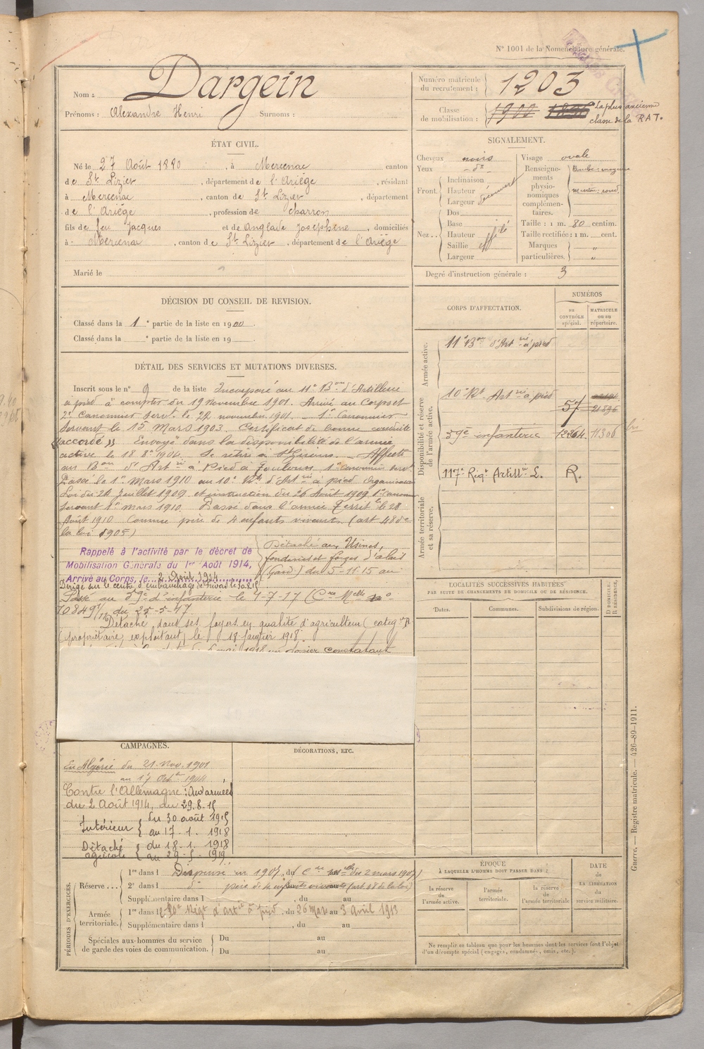 | Dargein | Alexandre Henri | FOIX | 129 W 5 | 1900 | Mercenac | Mercenac | 1203 |