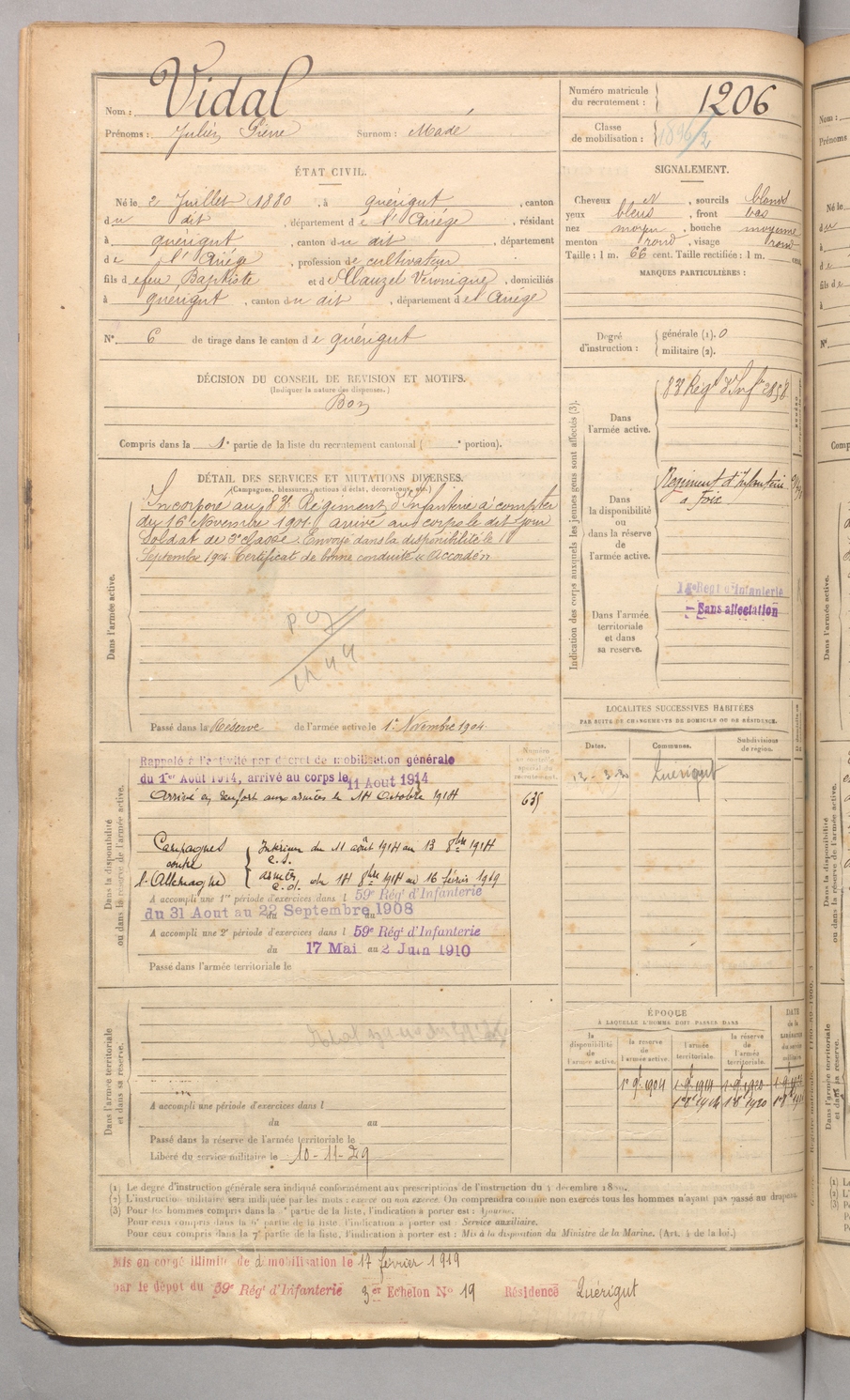 | Vidal | Julien Pierre dit Madé | FOIX | 129 W 4 | 1900 | Quérigut | Quérigut | 1206 |