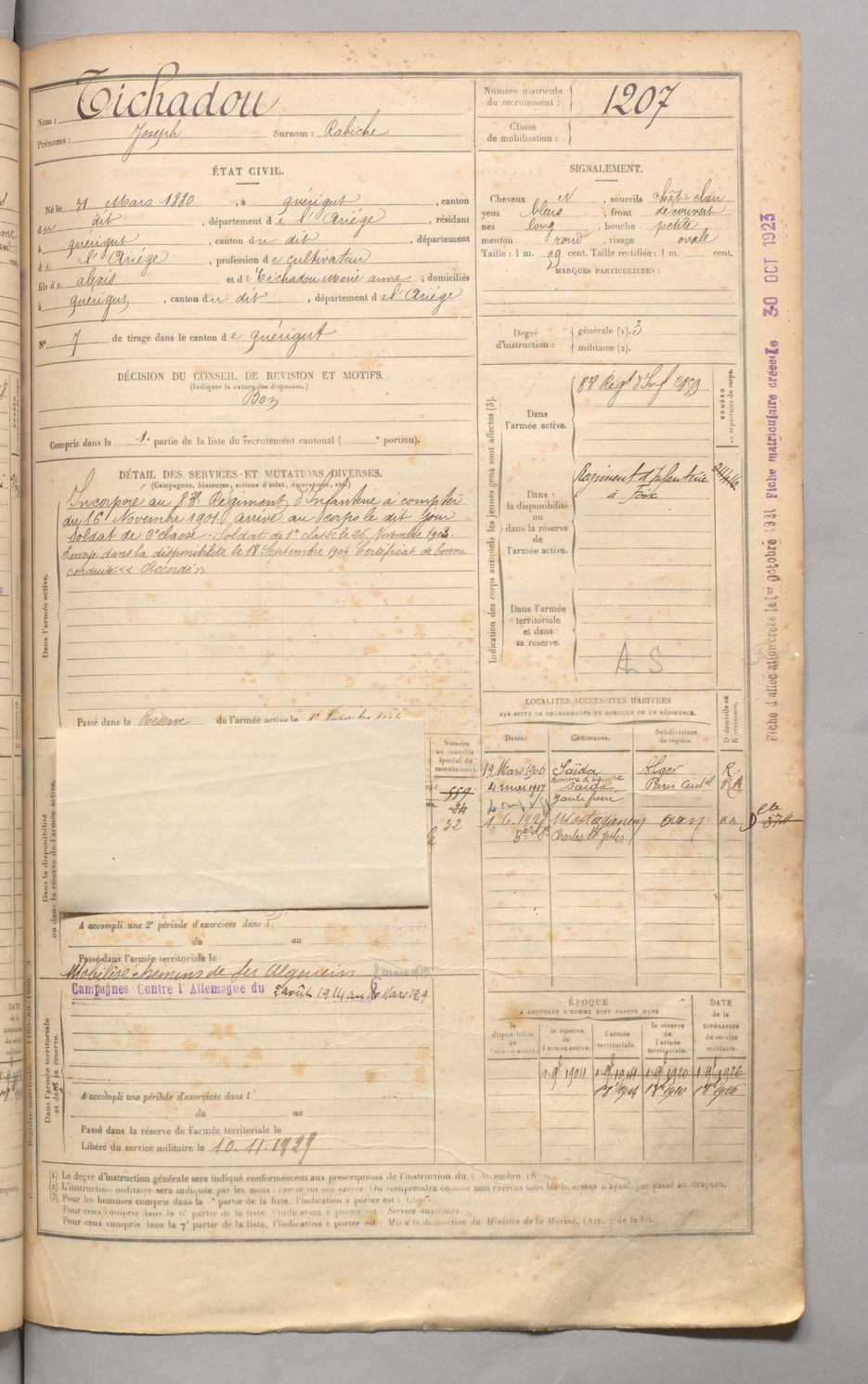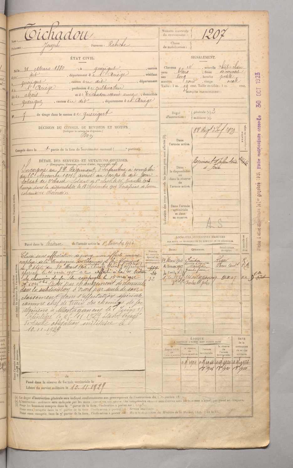 | Tichadou | Joseph dit Rabiche | FOIX | 129 W 4 | 1900 | Quérigut | Quérigut | 1207 |