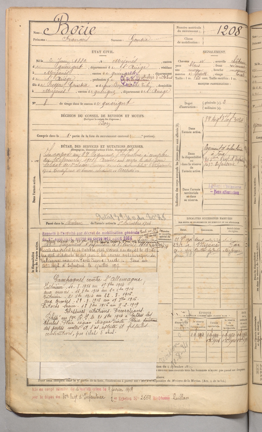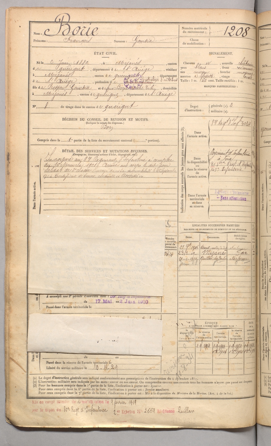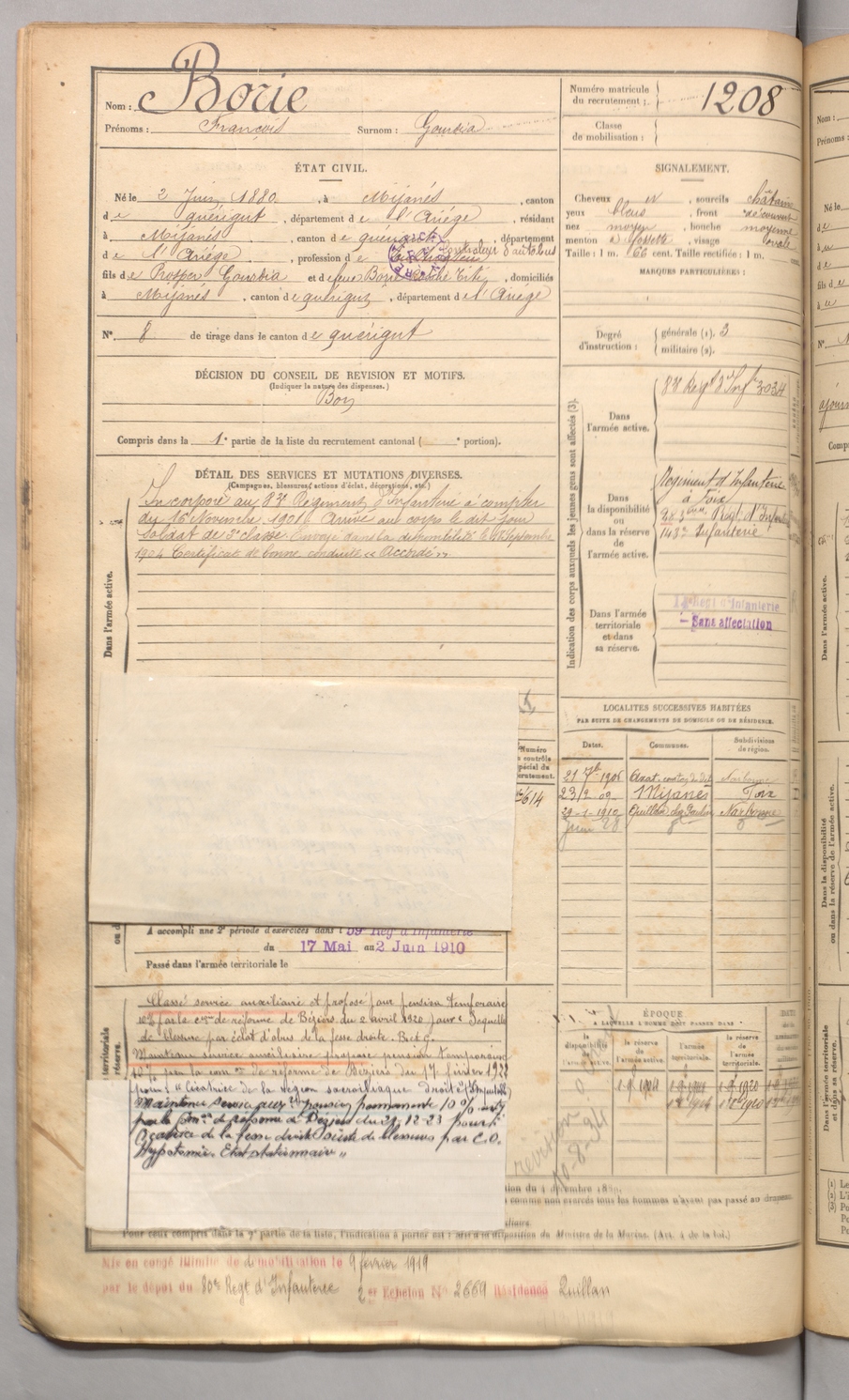 | Borie | François dit Goursia | FOIX | 129 W 4 | 1900 | Mijanès | Mijanès | 1208 |