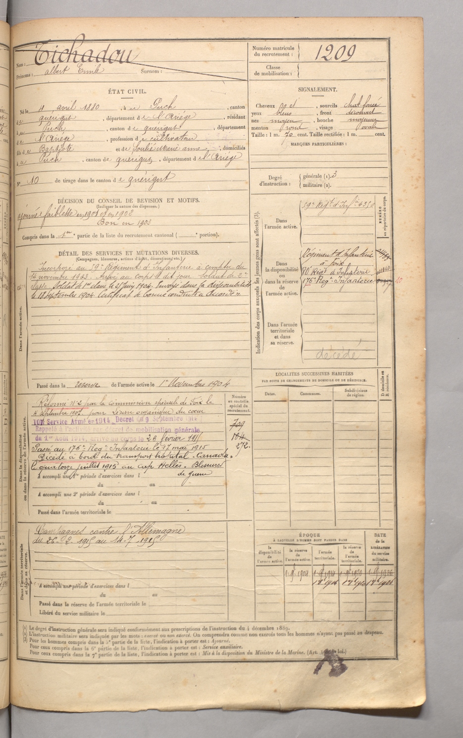 | Tichadou | Albert Emile | FOIX | 129 W 4 | 1900 | Puch (Le) | Puch (Le) | 1209 |