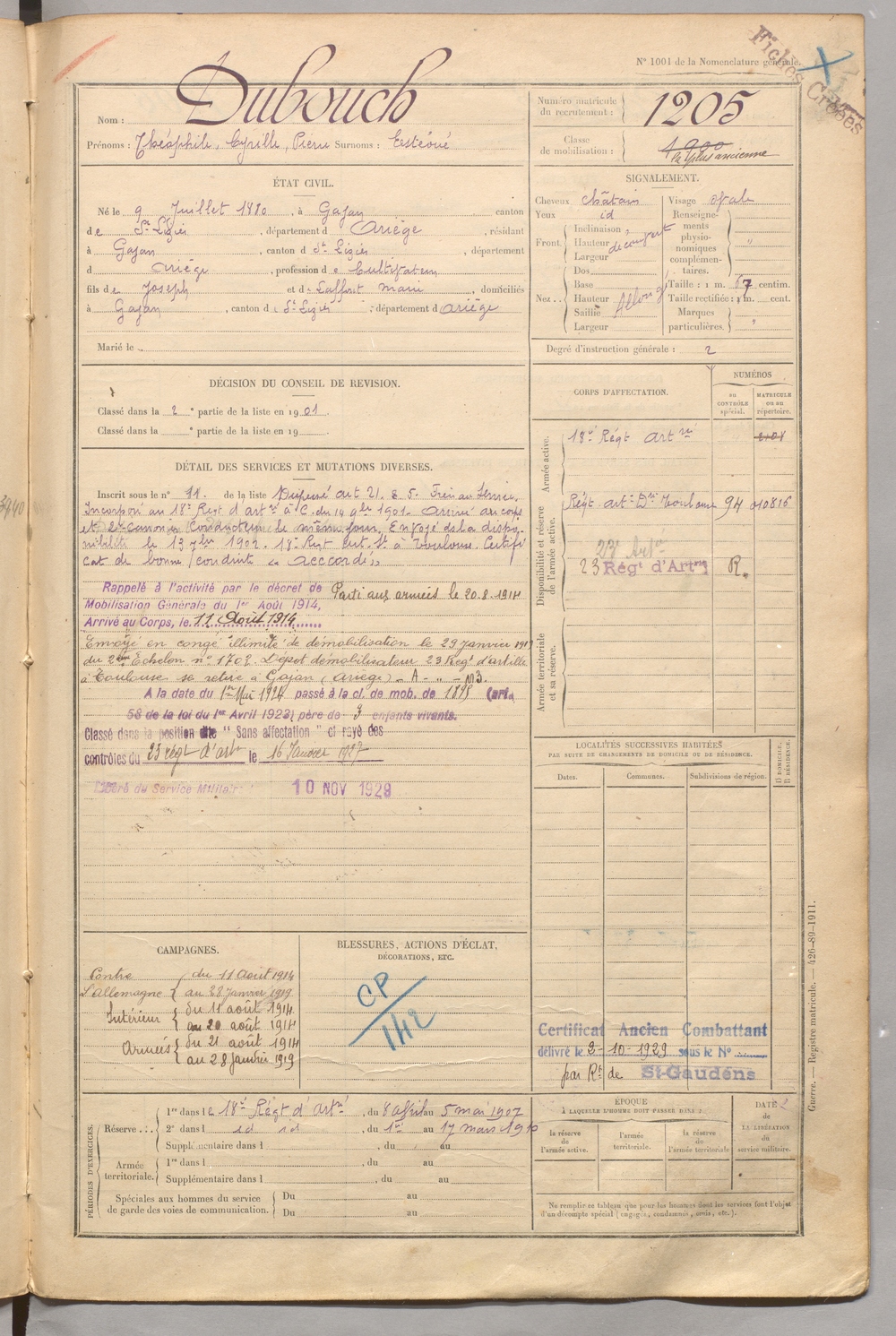 | Dubouch | Théophile Cyrille Pierre dit Estéoué | FOIX | 129 W 5 | 1900 | Gajan | Gajan | 1205 |
