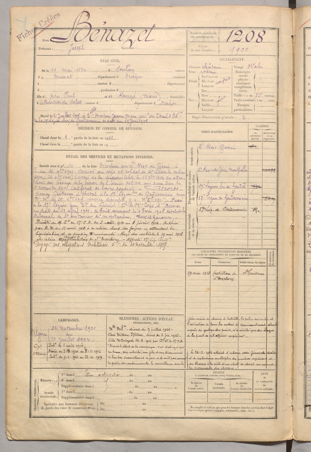 | Bénazet | Joseph | FOIX | 129 W 5 | 1900 | Soulan | 1208 |