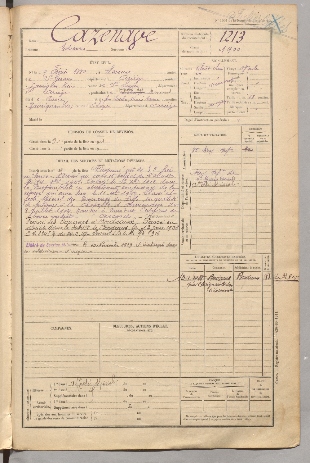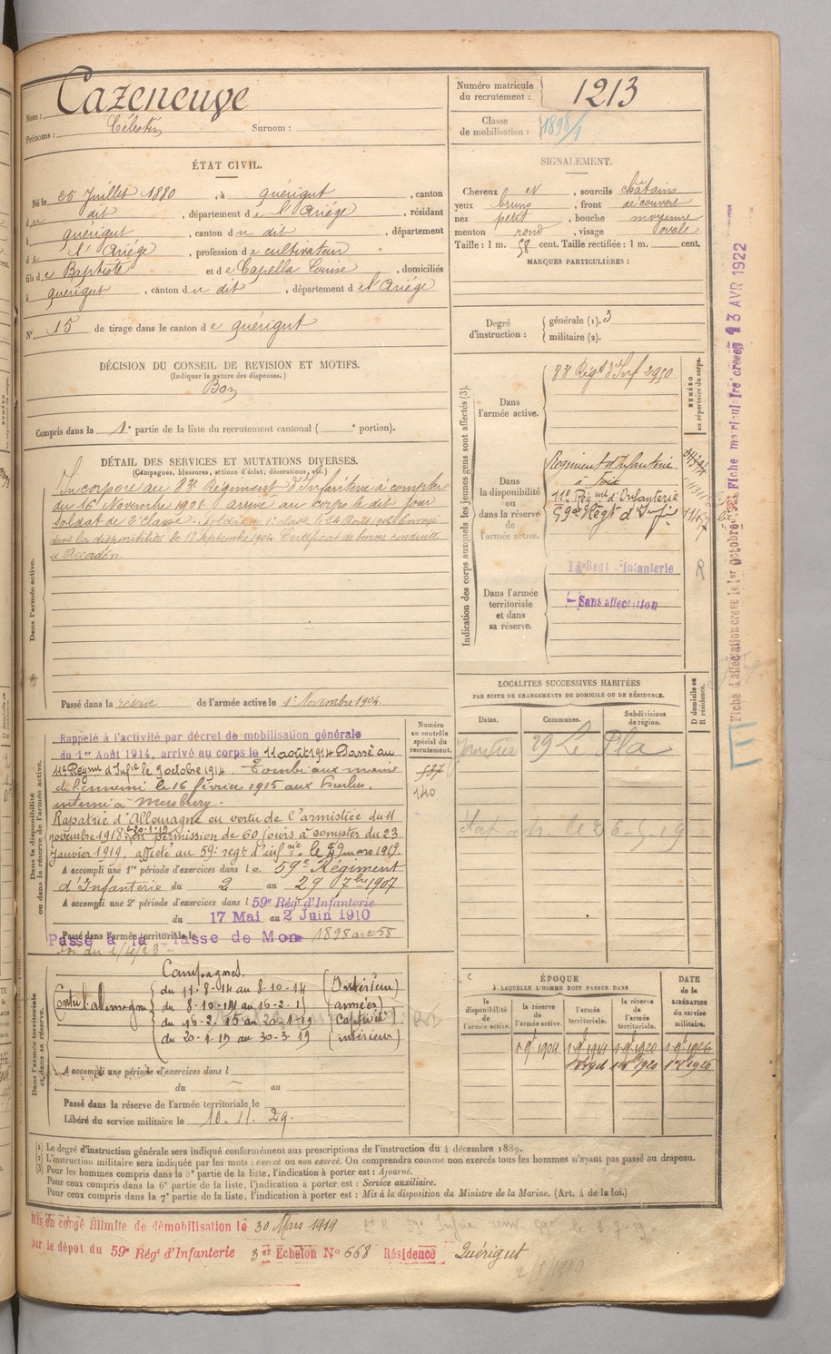 | Cazenave | Célestin | FOIX | 129 W 4 | 1900 | Quérigut | Quérigut | 1213 |
