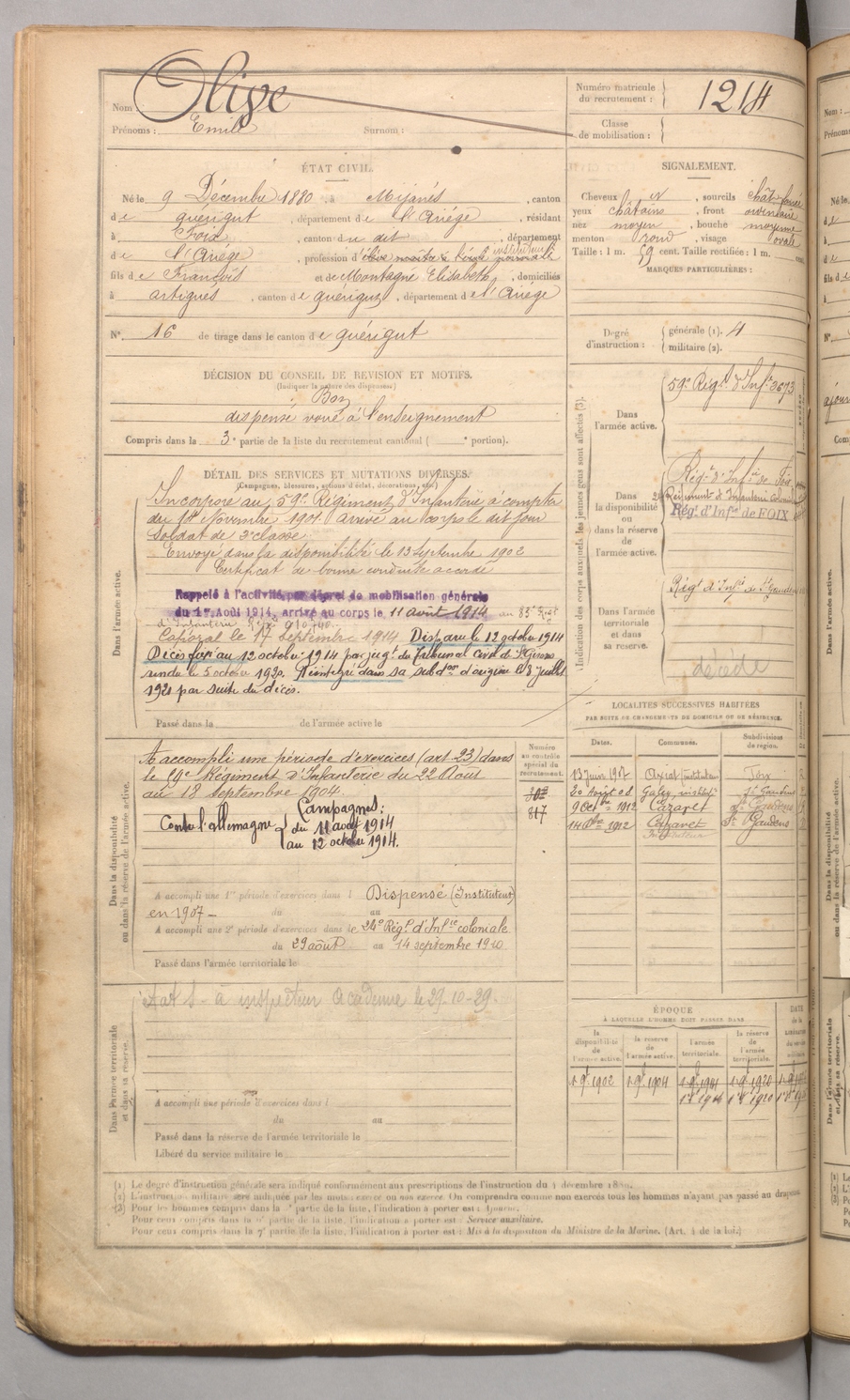 | Olive | Emile | FOIX | 129 W 4 | 1900 | Mijanès | Foix | 1214 |