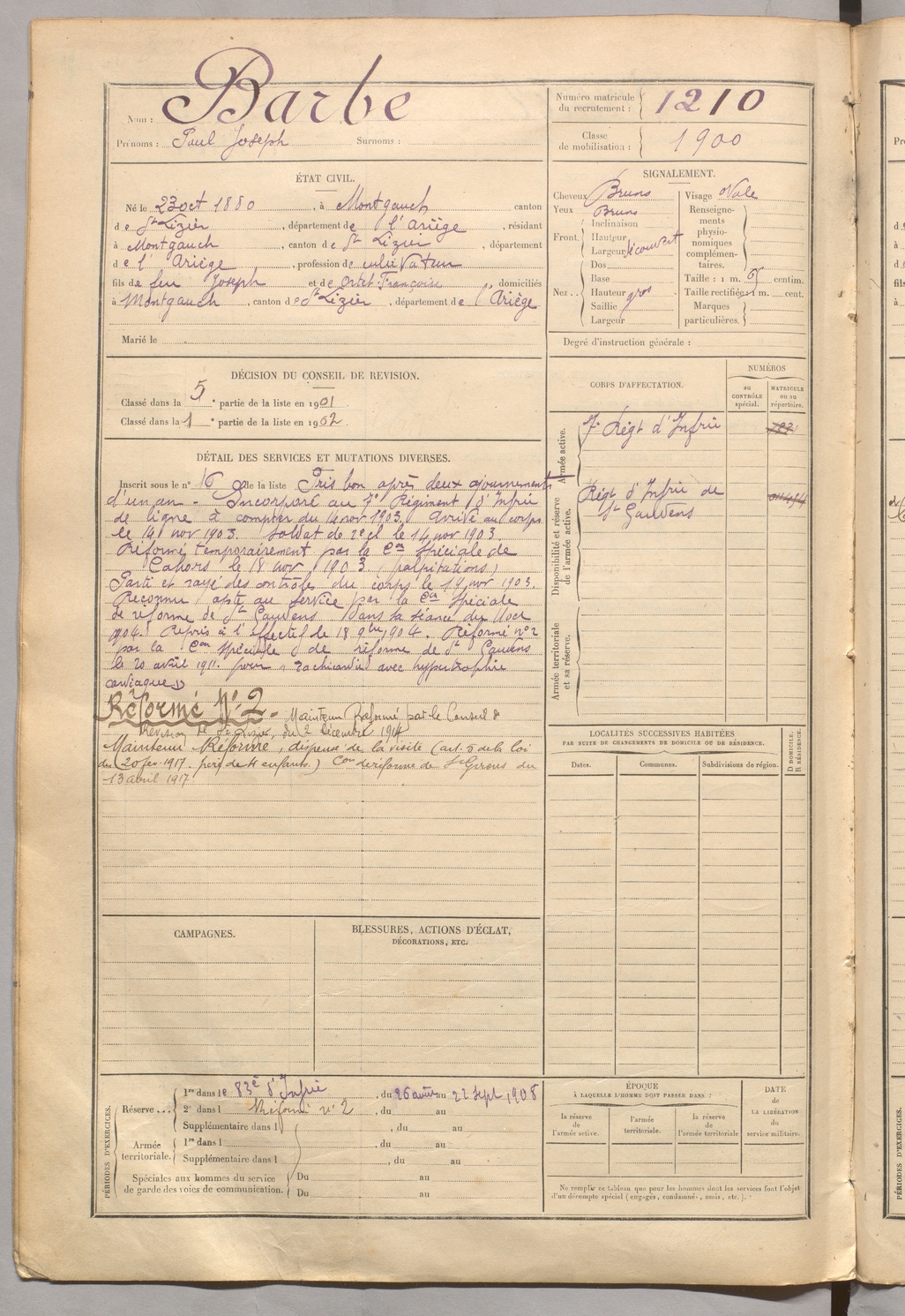 | Barbe | Paul Joseph | FOIX | 129 W 5 | 1900 | Montgauch | Montgauch | 1210 |