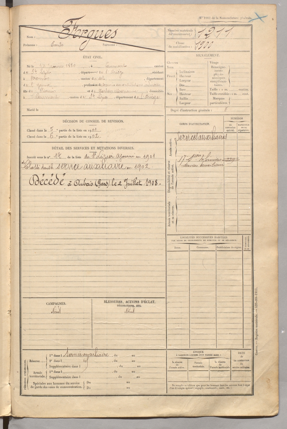 | Forgues | Emile | FOIX | 129 W 5 | 1900 | Caumont | Briennon | 1211 |
