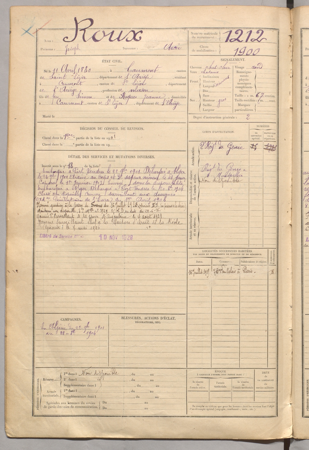 | Roux | Joseph dit Arcie | FOIX | 129 W 5 | 1900 | Caumont | Caumont | 1212 |