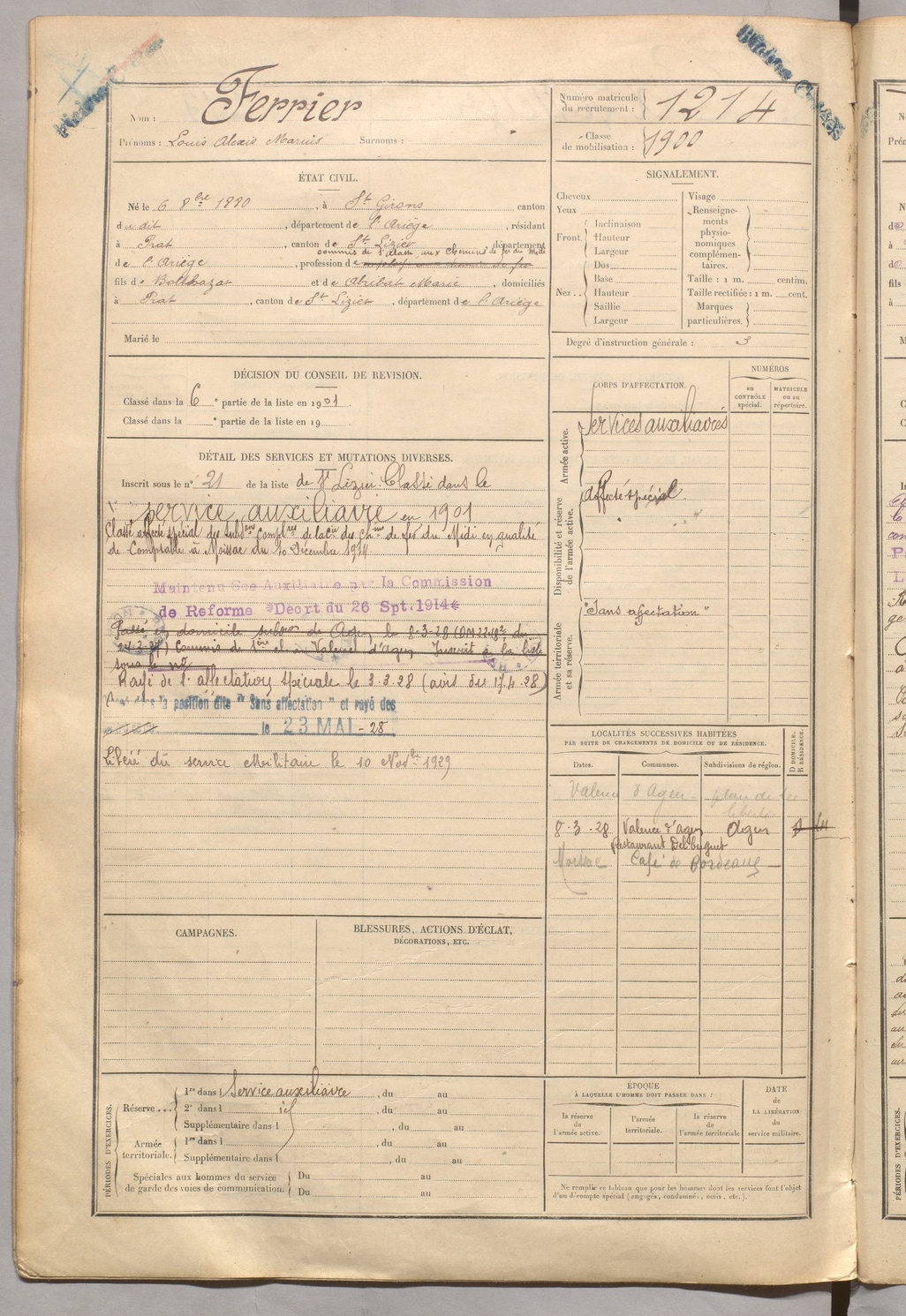 | Ferrier | Louis Alexis Marius | FOIX | 129 W 5 | 1900 | Saint-Girons | Prat-et-Bonrepaux | 1214 |