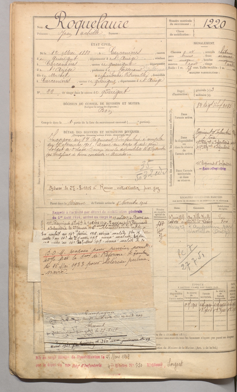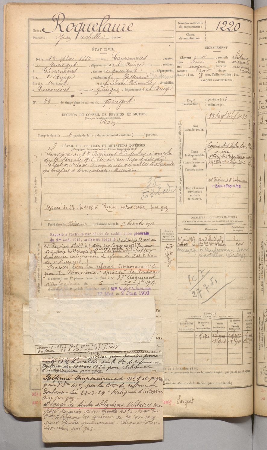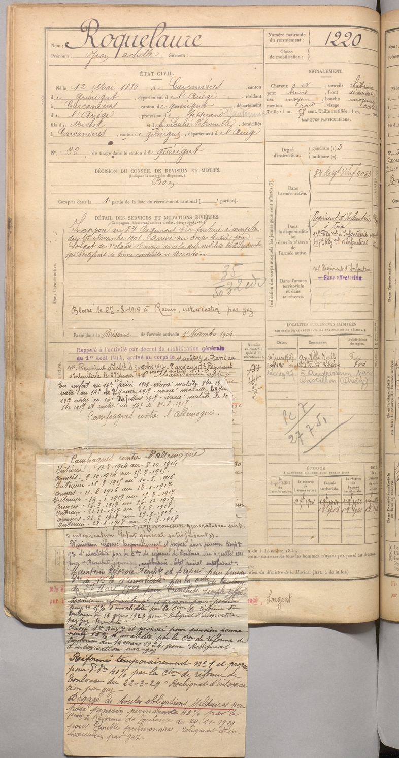 | Roquelaure | Jean Achille | FOIX | 129 W 4 | 1900 | Carcanières | Carcanières | 1220 |