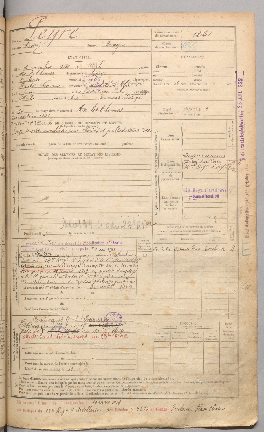 | Peyre | André dit Mougeu | FOIX | 129 W 4 | 1900 | Orlu | Toulouse | 1221 |