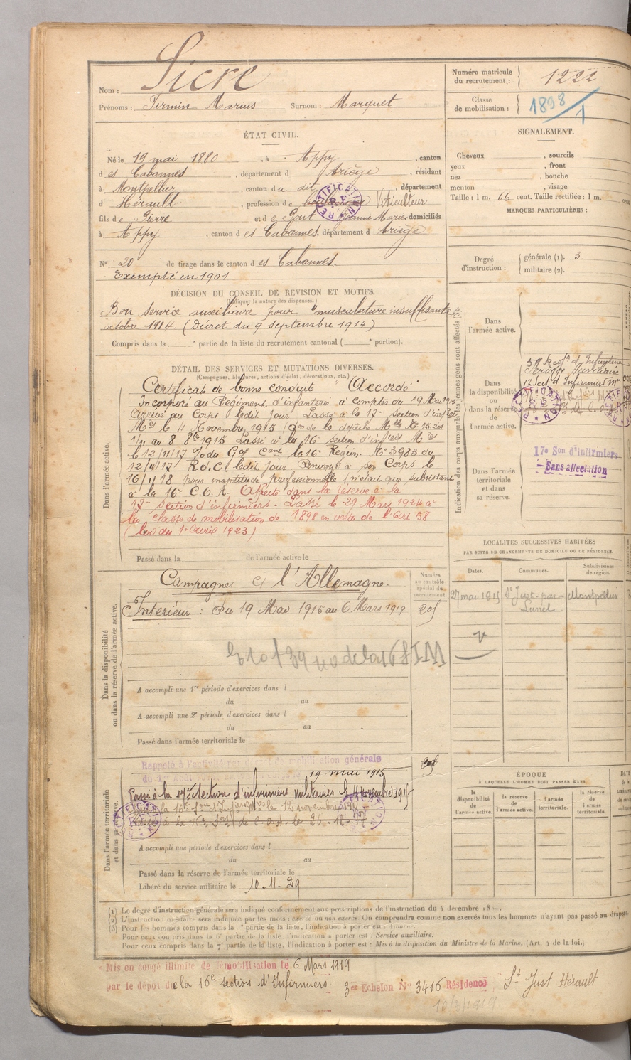 | Sicre | Firmin Marius dit Marquet | FOIX | 129 W 4 | 1900 | Appy | Montpellier | 1222 |