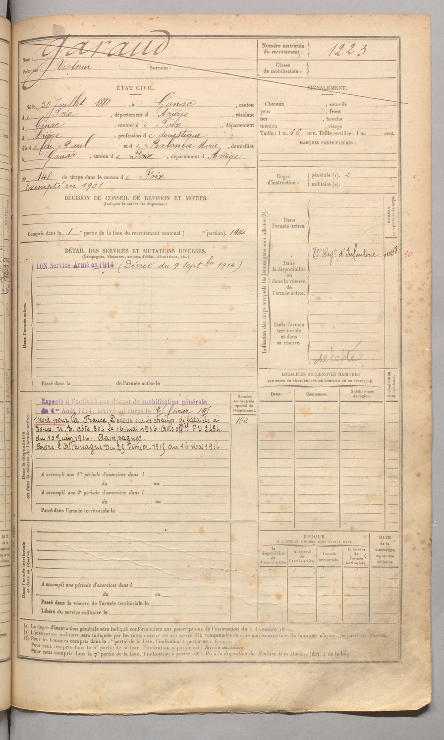 | Garaud | Victorin | FOIX | 129 W 4 | 1900 | Ganac | Ganac | 1223 |