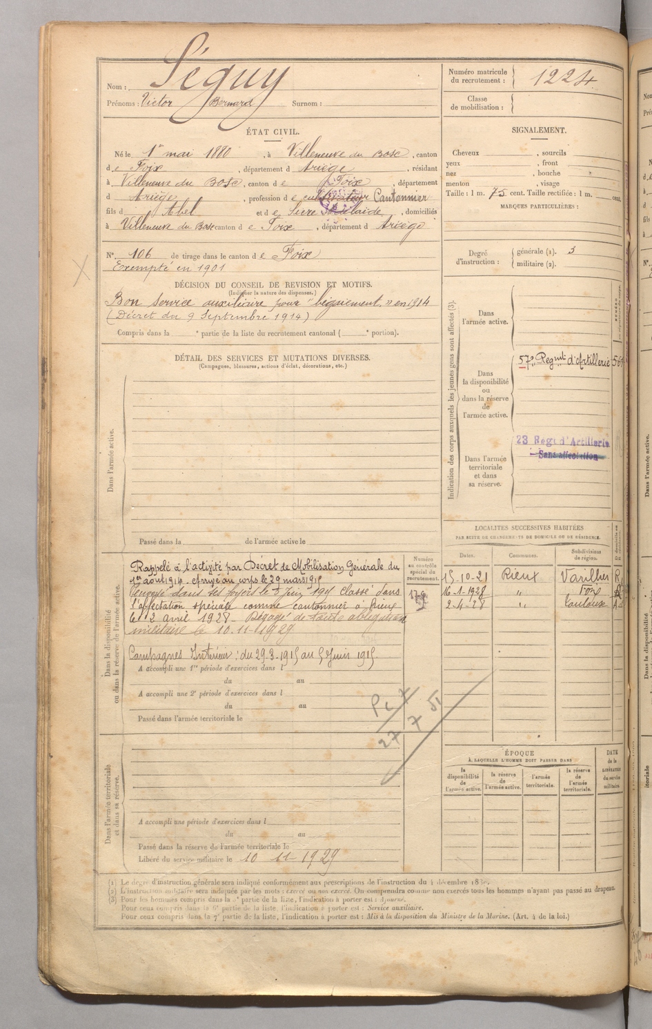 | Séguy | Victor Bernard | FOIX | 129 W 4 | 1900 | Villeneuve-du-Bosc | Villeneuve-du-Bosc | 1224 |