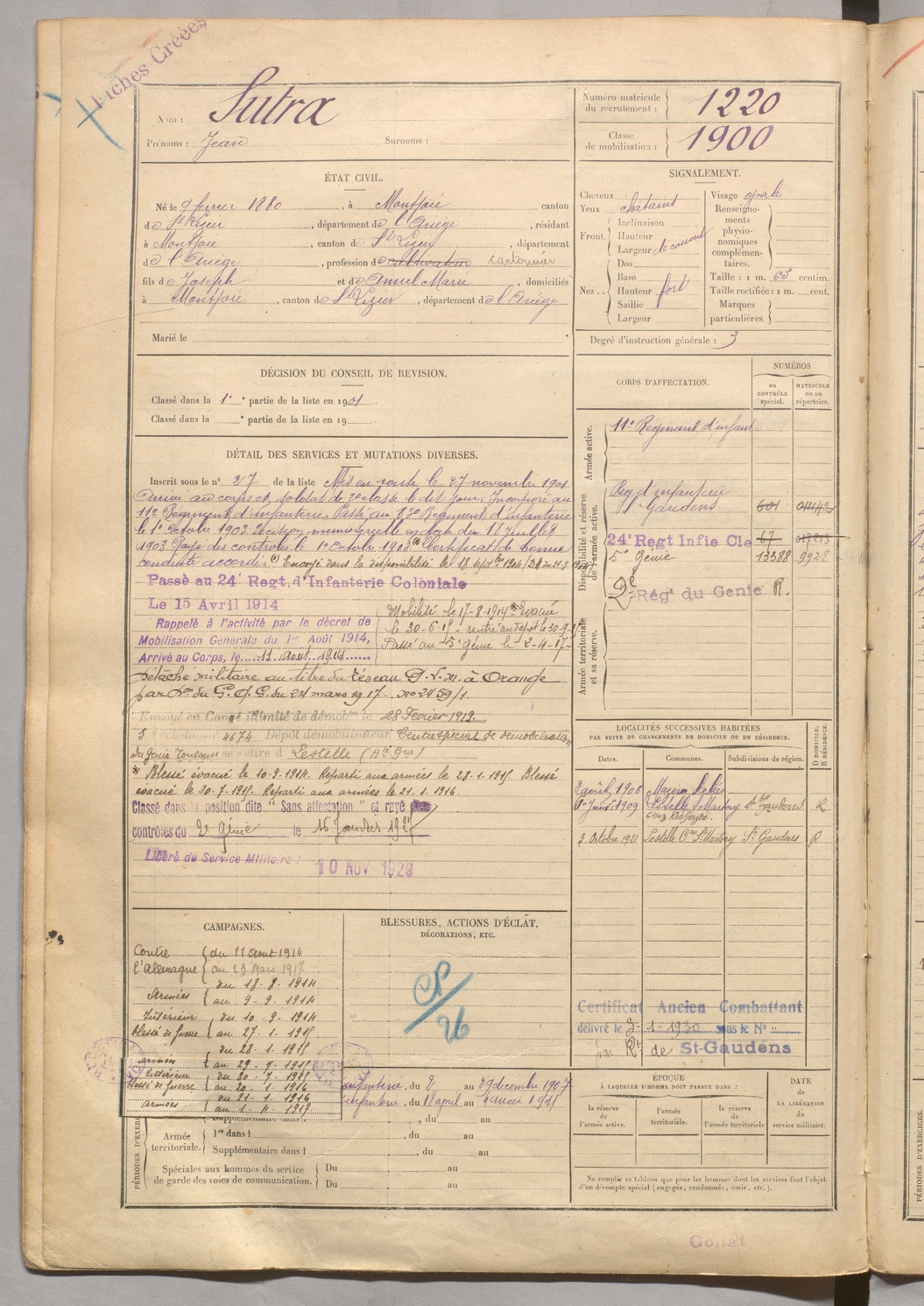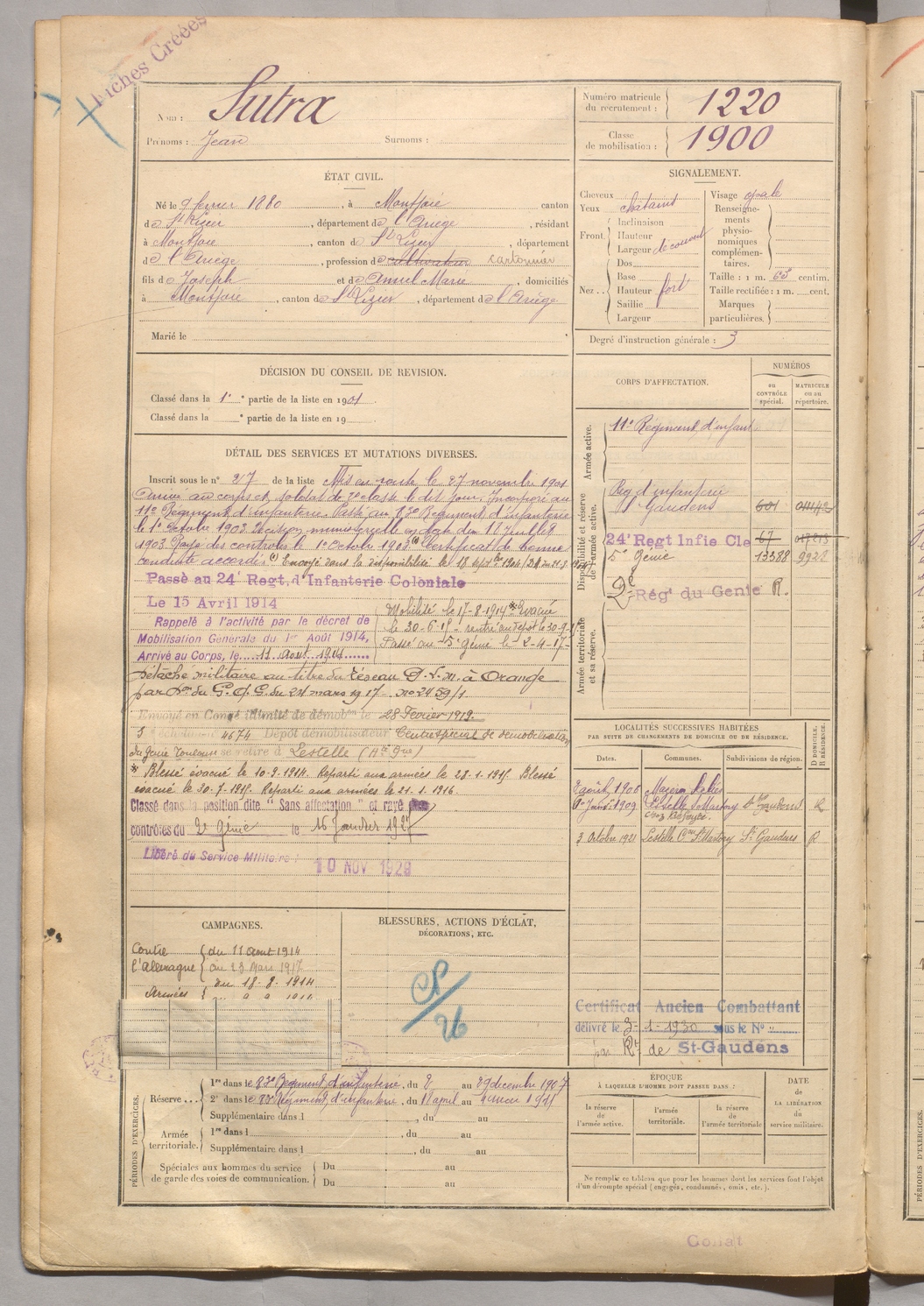 | Sutra | Jean | FOIX | 129 W 5 | 1900 | Montjoie | Montjoie | 1220 |