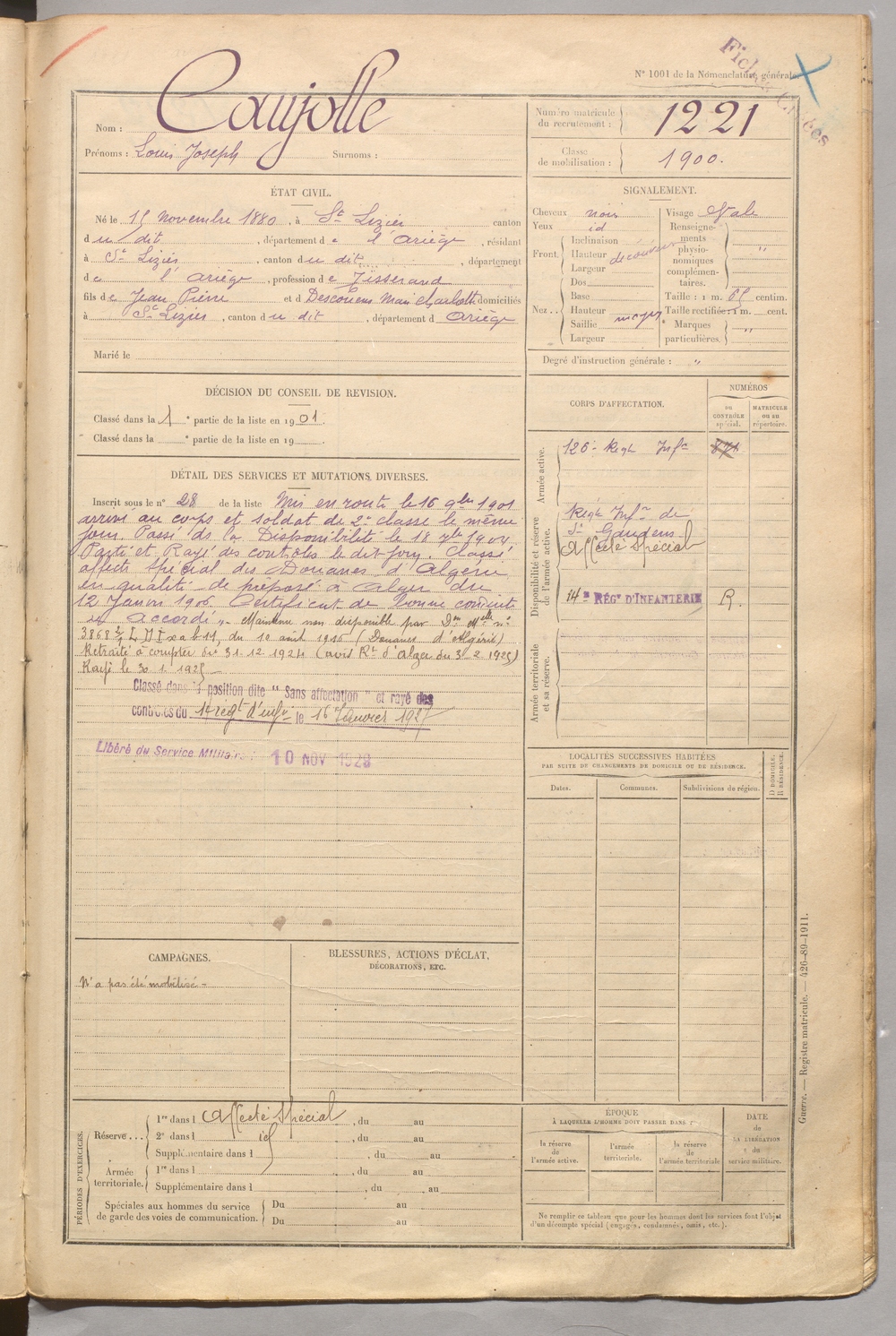 | Caujolle | Louis Joseph | FOIX | 129 W 5 | 1900 | Saint-Lizier | Saint-Lizier | 1221 |