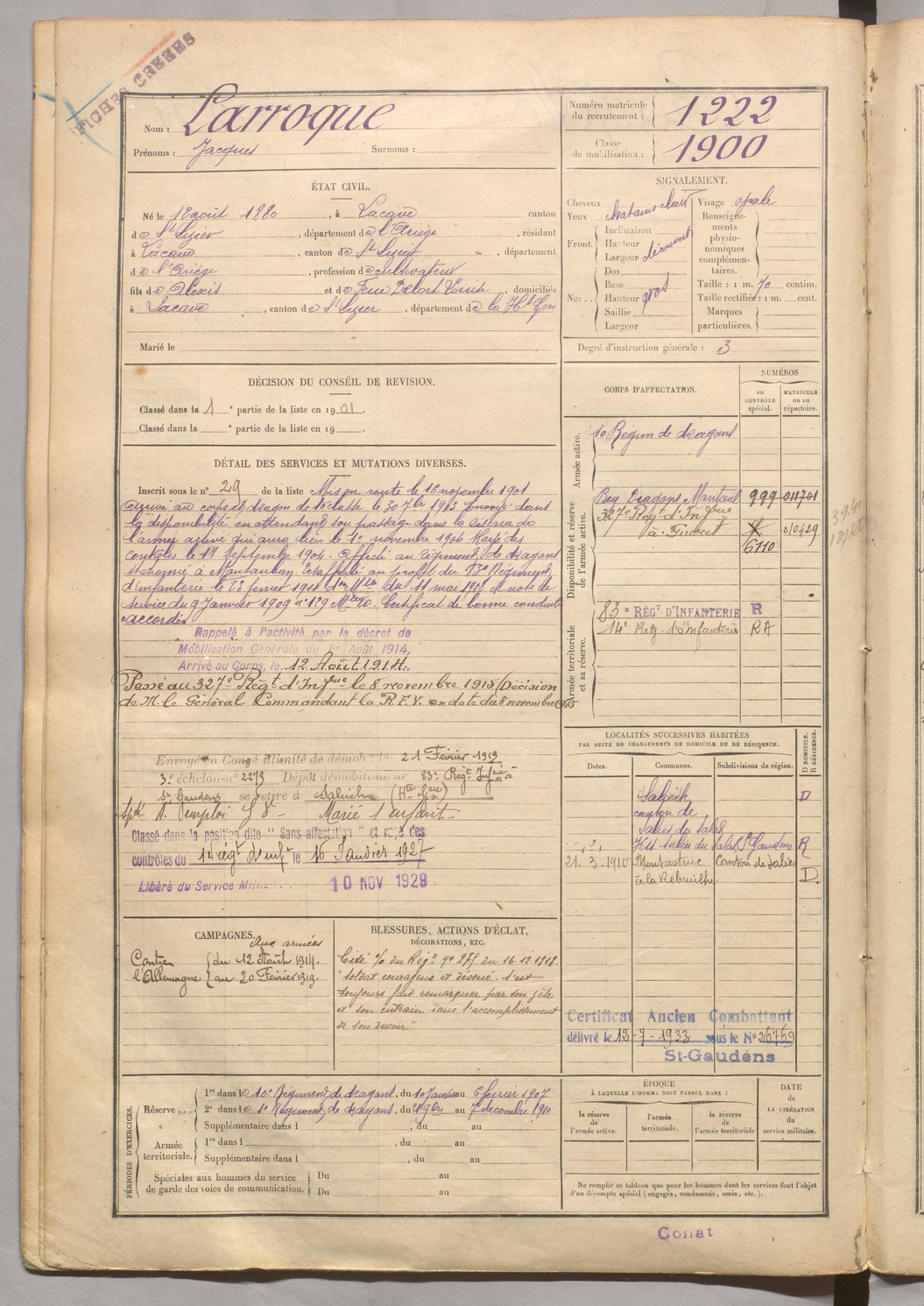 | Larroque | Jacques | FOIX | 129 W 5 | 1900 | Lacave | Lacave | 1222 |