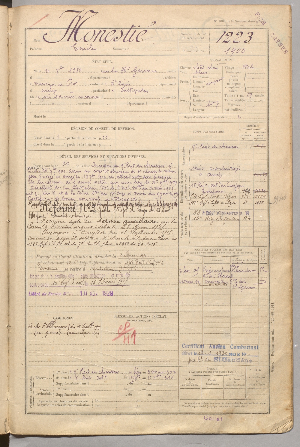 | Monestié | Emile | FOIX | 129 W 5 | 1900 | Haute-Garonne | Mauvezin-de-Prat | 1223 |