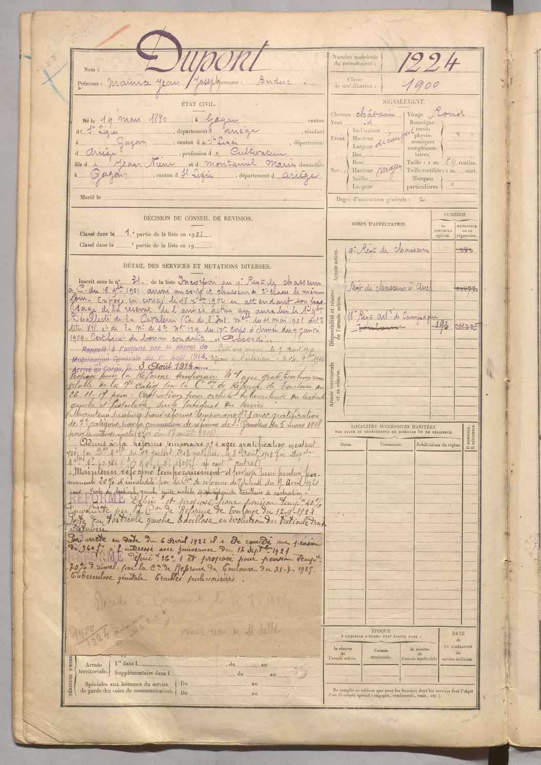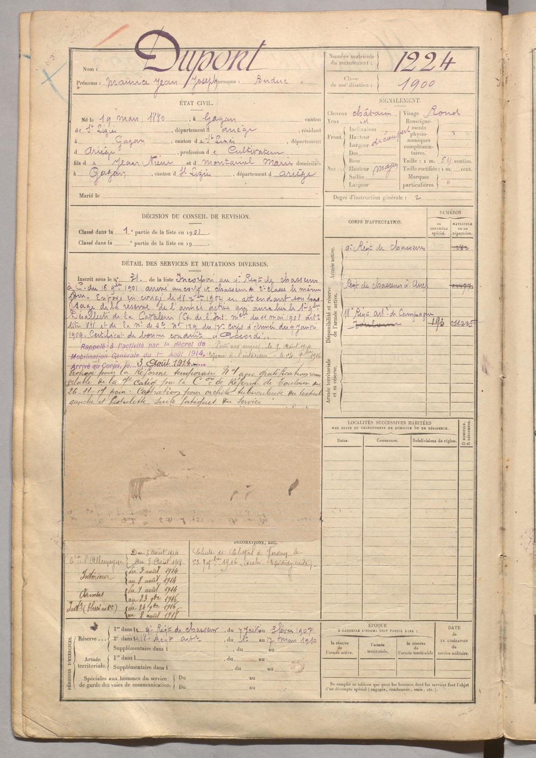 | Dupont | Maurice Jean Joseph dit Buduc | FOIX | 129 W 5 | 1900 | Gajan | Gajan | 1224 |