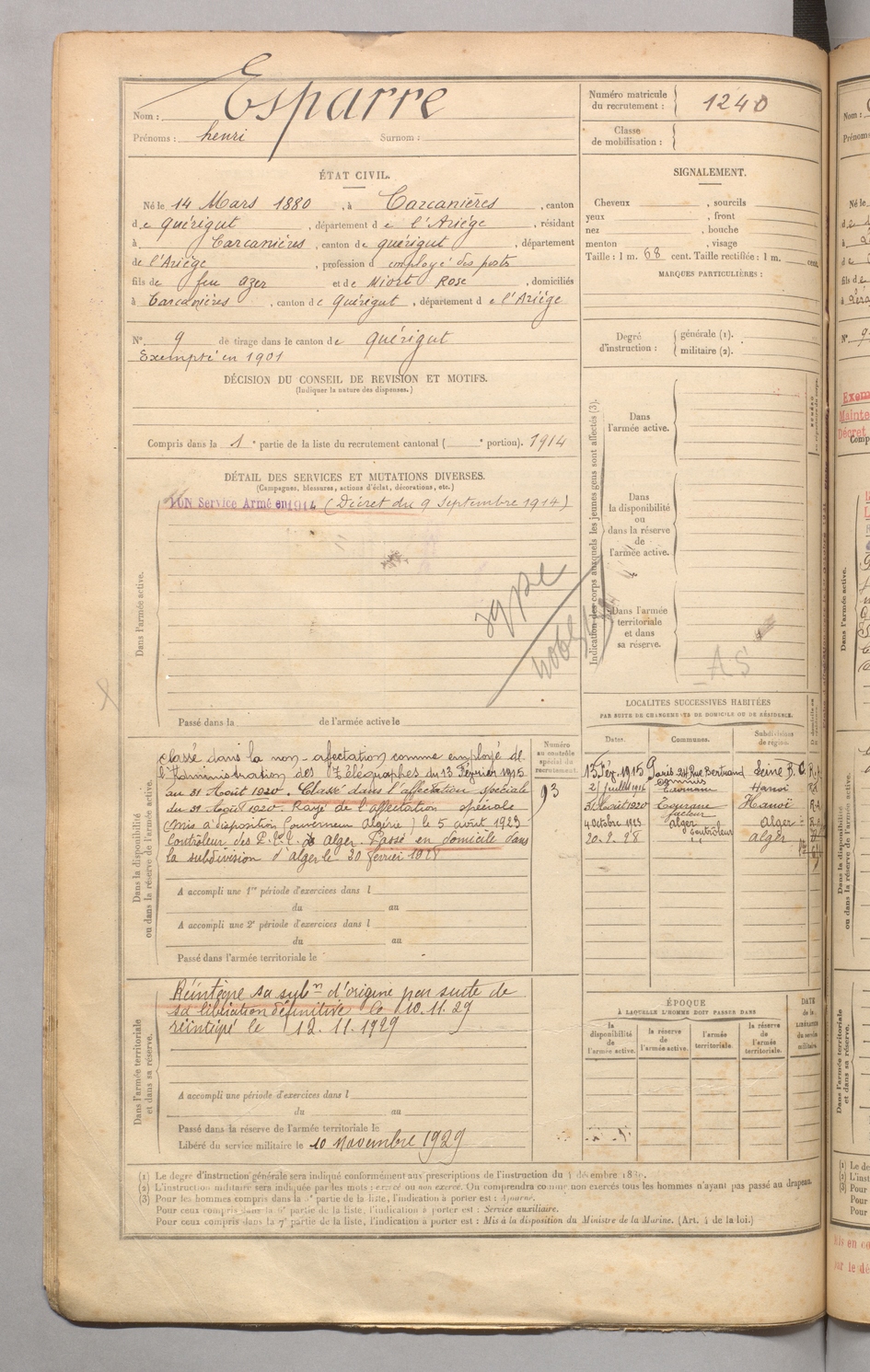 | Esparre | Henri | FOIX | 129 W 4 | 1900 | Carcanières | Carcanières | 1240 |
