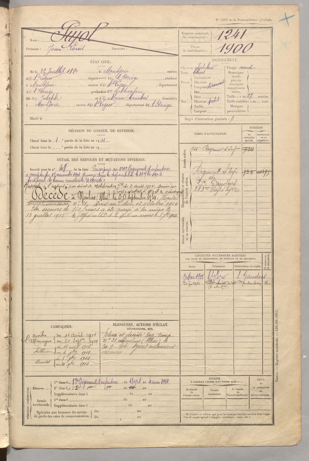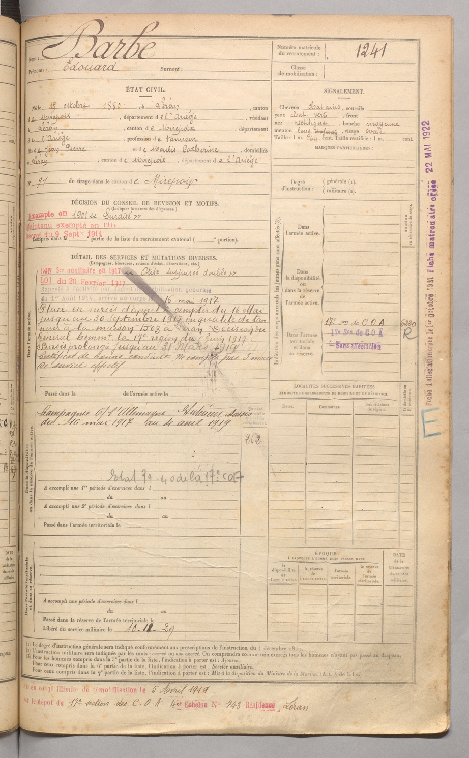 | Fauroux | Siméon Paul | FOIX | 129 W 5 | 1900 | Montjoie | Montjoie | 1244 |