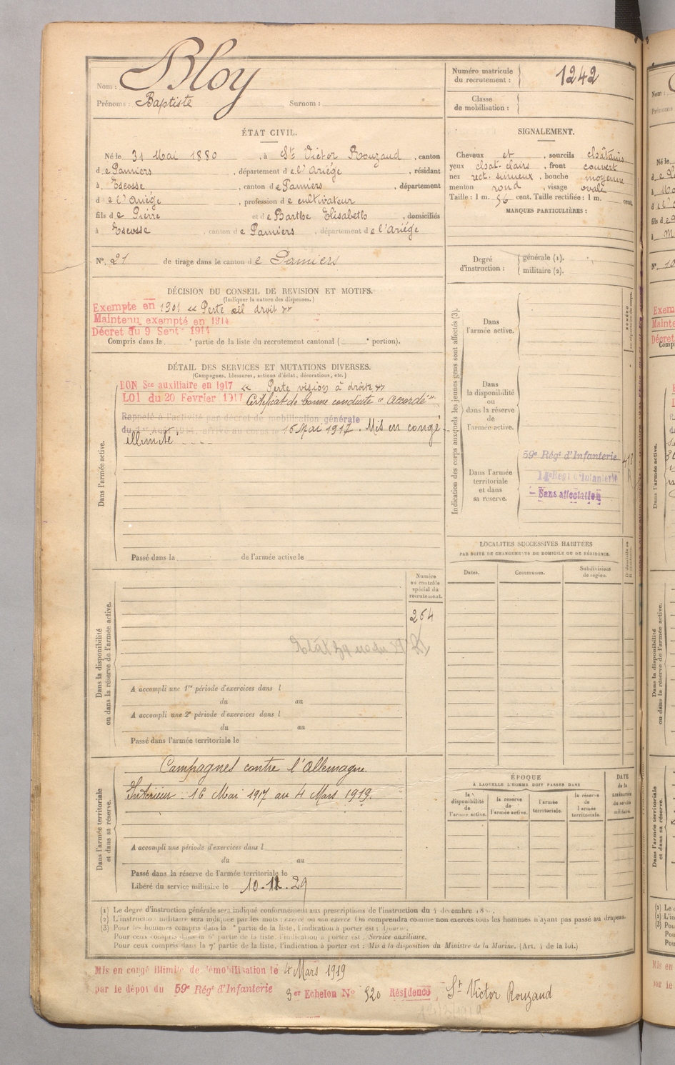 | Bloy | Baptiste | FOIX | 129 W 4 | 1900 | Saint-Victor-Rouzaud | Escosse | 1242 |