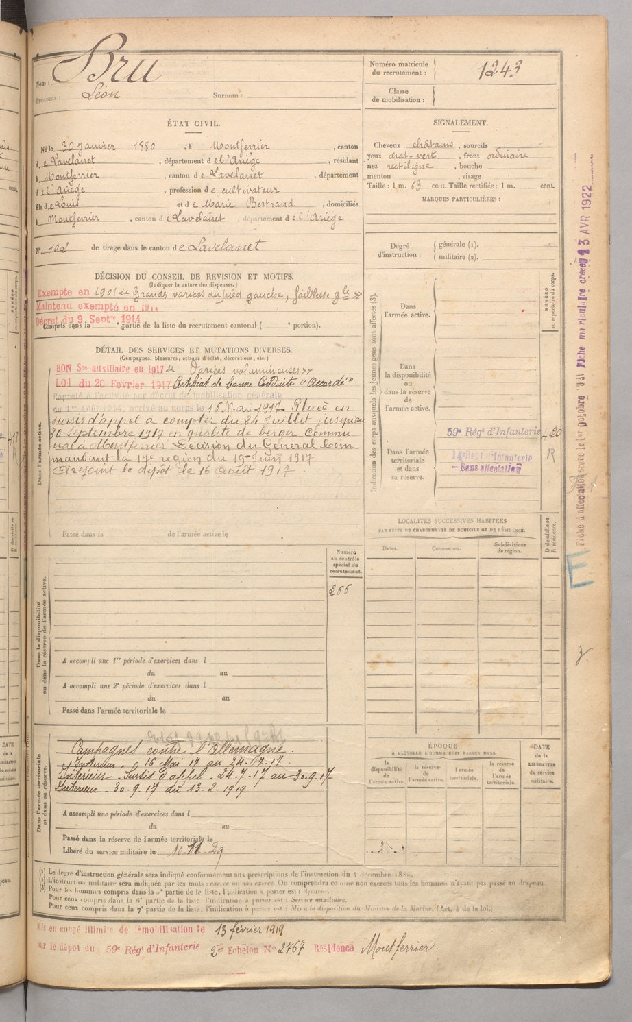 | Bru | Léon | FOIX | 129 W 4 | 1900 | Montferrier | Montferrier | 1243 |