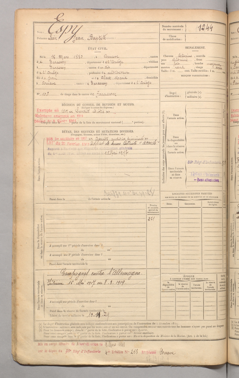 | Espy | Léon Jean Baptiste | FOIX | 129 W 4 | 1900 | Arnave | Tarascon | 1244 |
