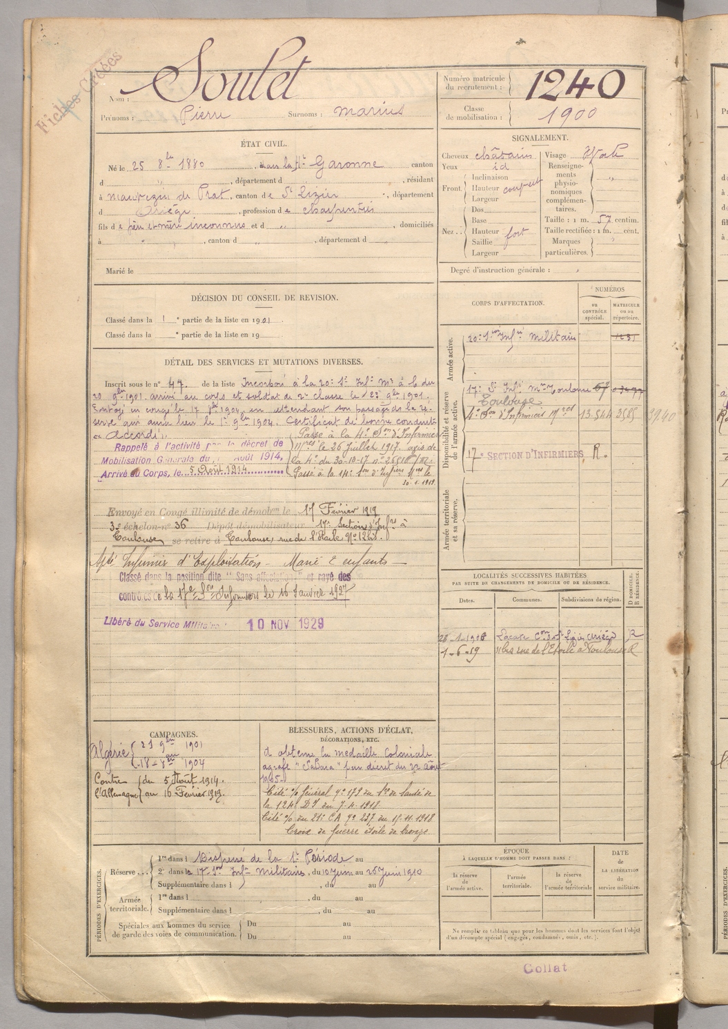 | Soulet | Pierre dit Marius | FOIX | 129 W 5 | 1900 | Haute-Garonne | Mauvezin-de-Prat | 1240 |