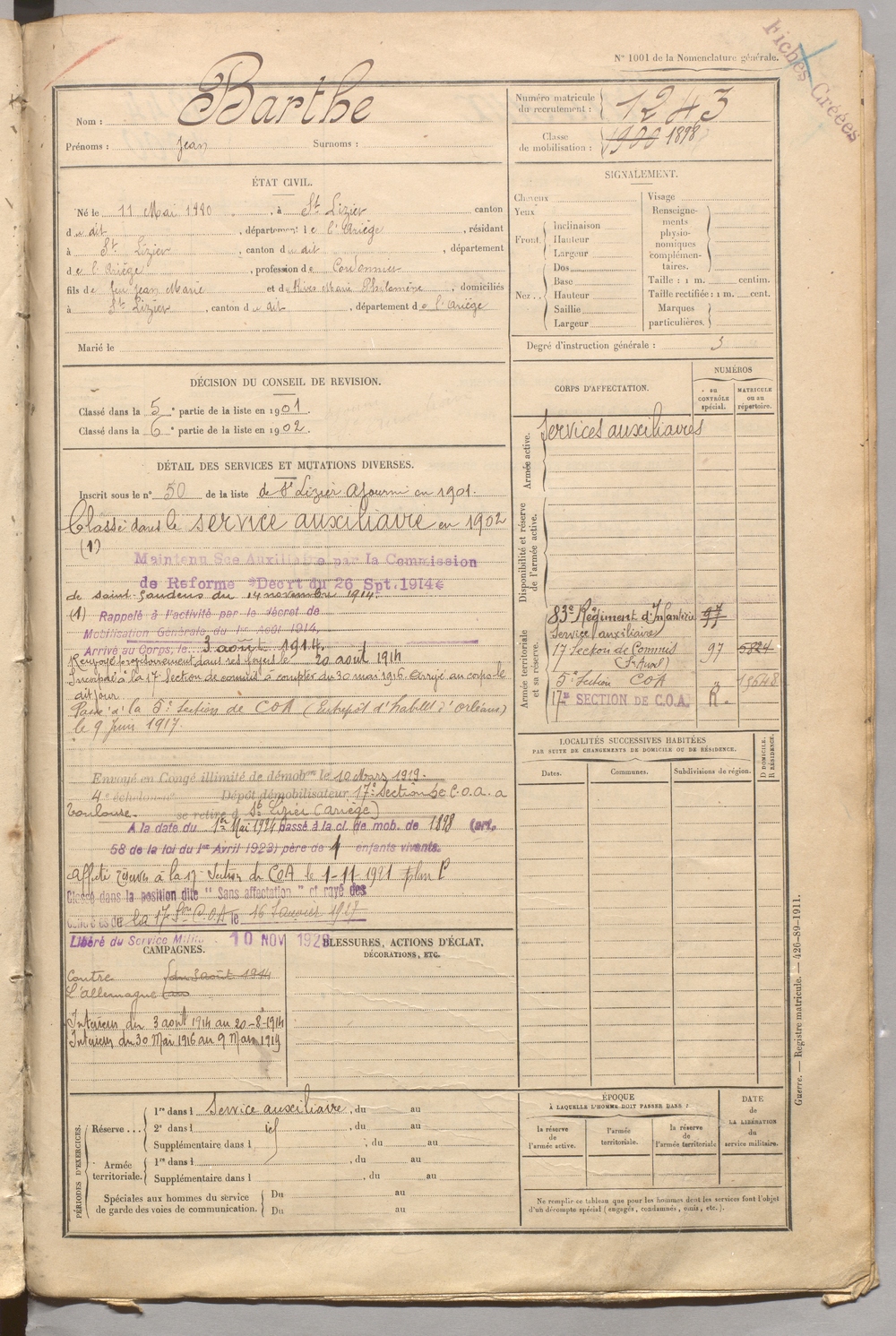 | Barthe | Jean | FOIX | 129 W 5 | 1900 | Saint-Lizier | Saint-Lizier | 1243 |
