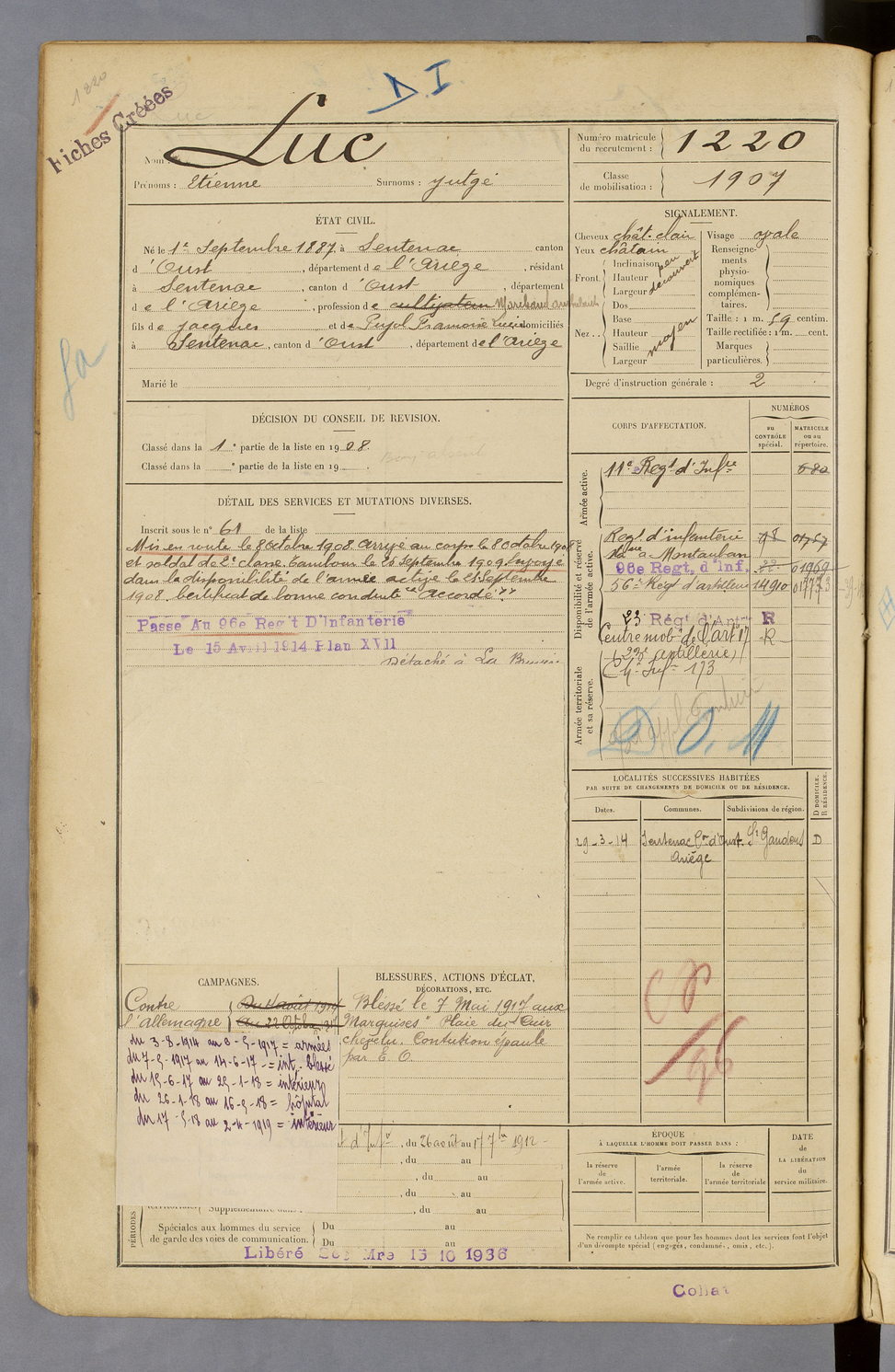 | Luc | Etienne dit Jutgé | FOIX | 129 W 40 | 1907 | Sentenac | Sentenac | 1220 |