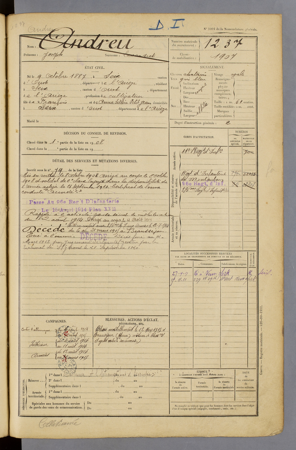 | Andreu | Joseph dit Lamandret | FOIX | 129 W 40 | 1907 | Seix | Seix | 1237 |