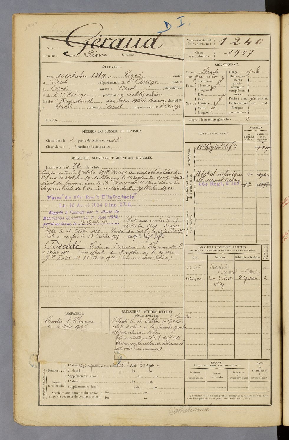 | Géraud | Pierre | FOIX | 129 W 40 | 1907 | Ercé | Ercé | 1240 |