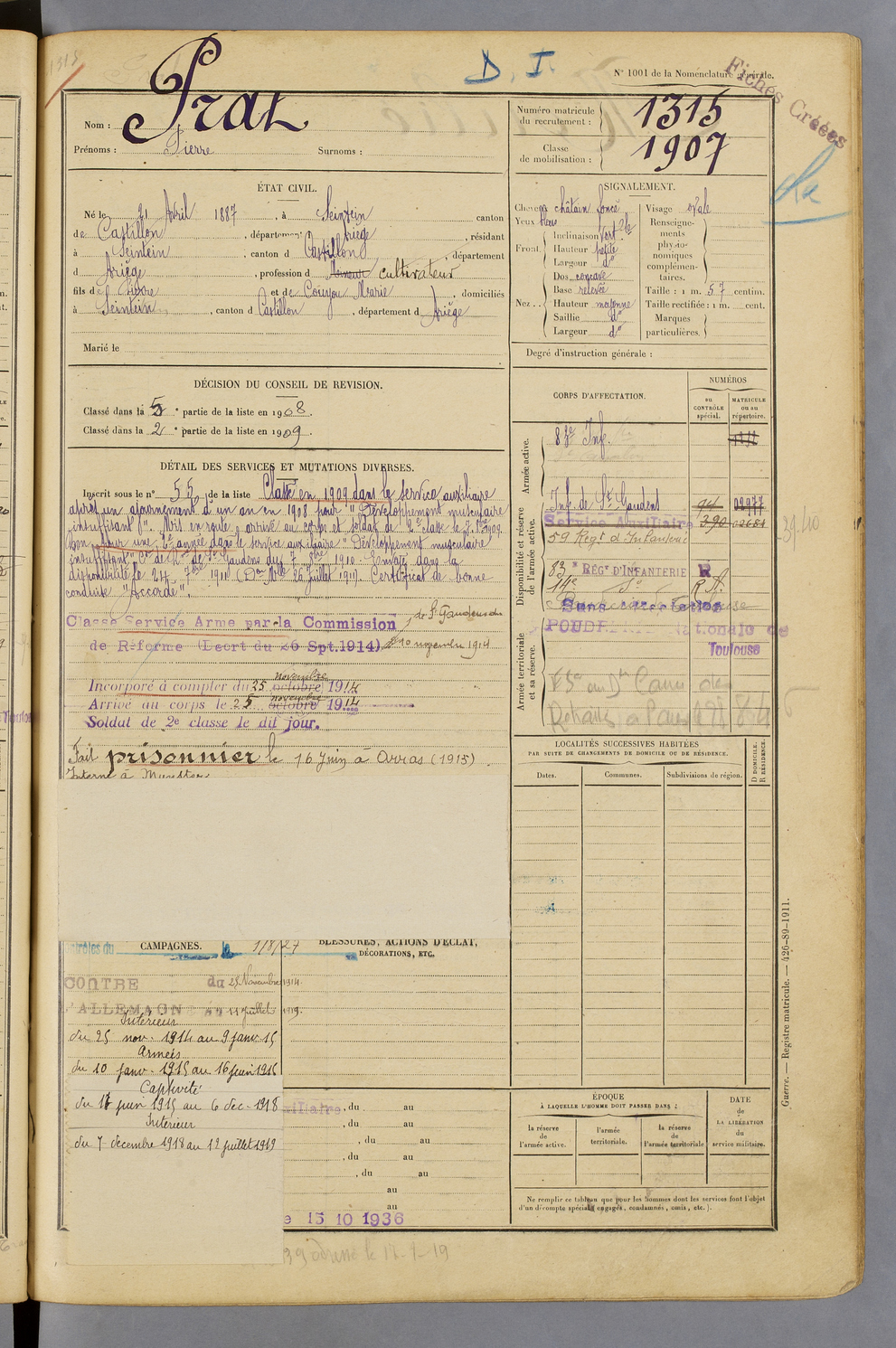 | Dubuc | François dit Bagalet | FOIX | 129 W 40 | 1907 | Balaguères | Balaguères | 1313 |