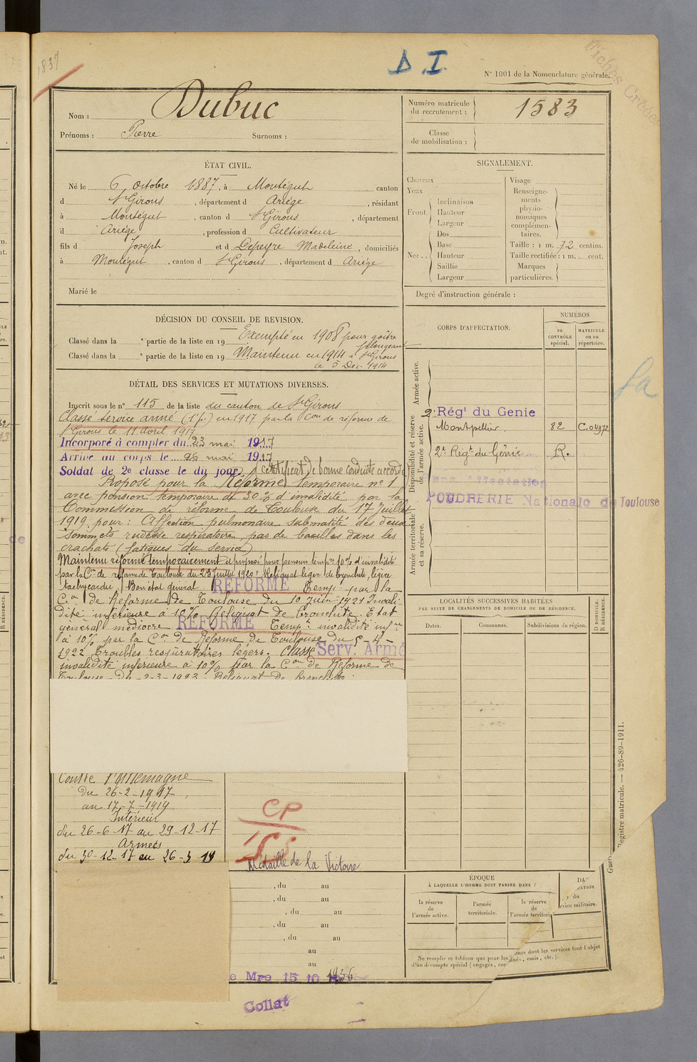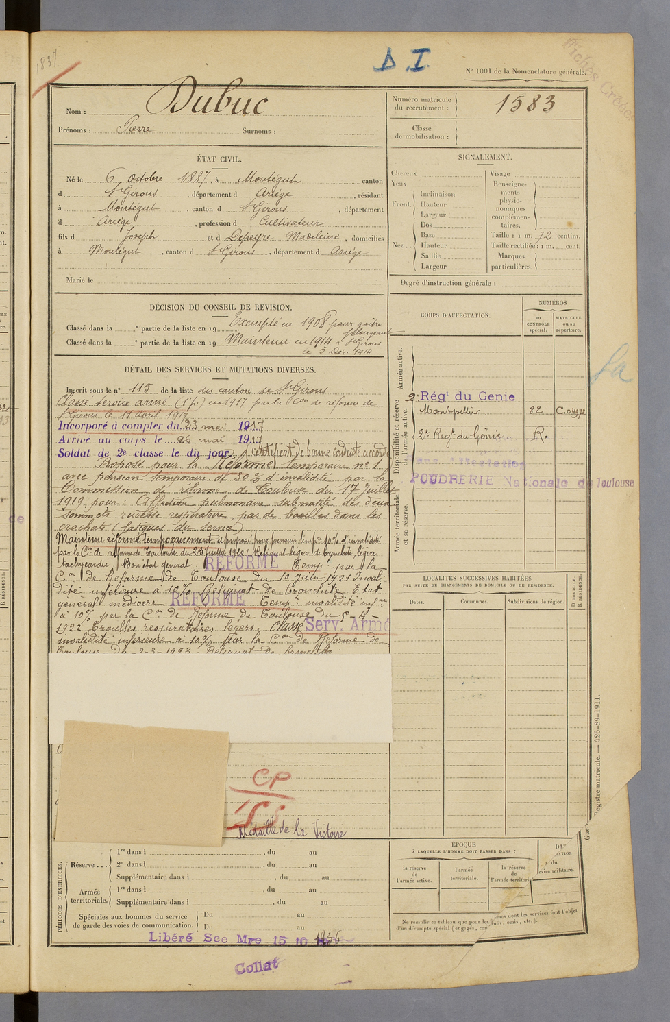 | Dubuc | Pierre | FOIX | 129 W 40 | 1907 | Montégut | Montégut | 1583 |