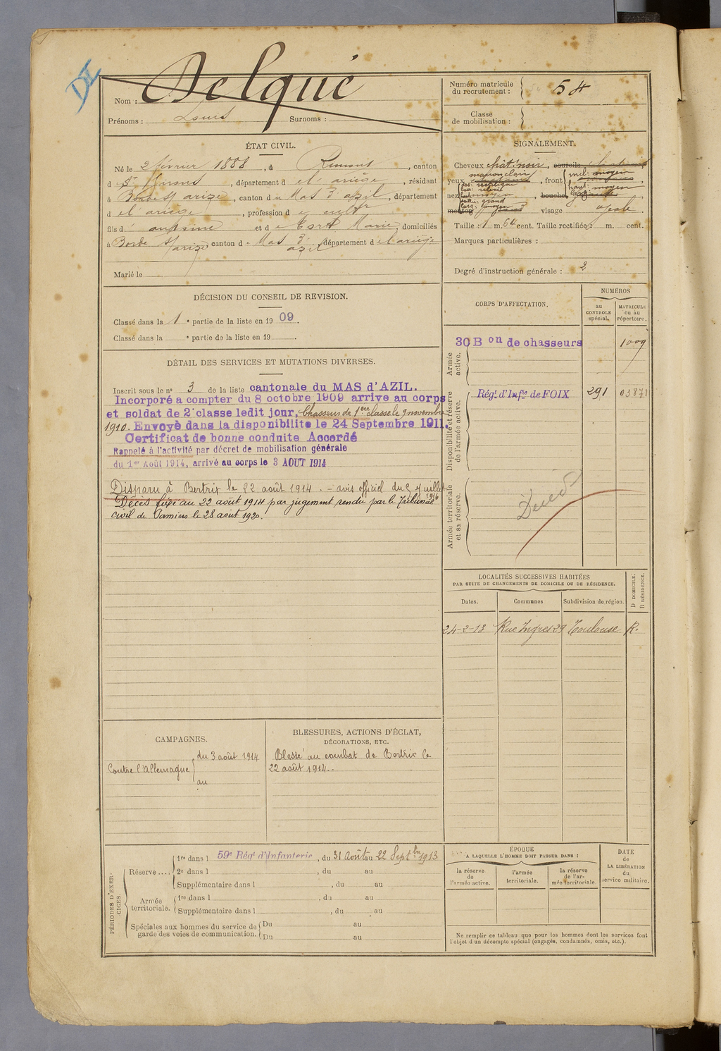 | Delqué | Louis | FOIX | 129 W 42 | 1908 | Rimont | Bordes-sur-Arize (Les) | 54 |