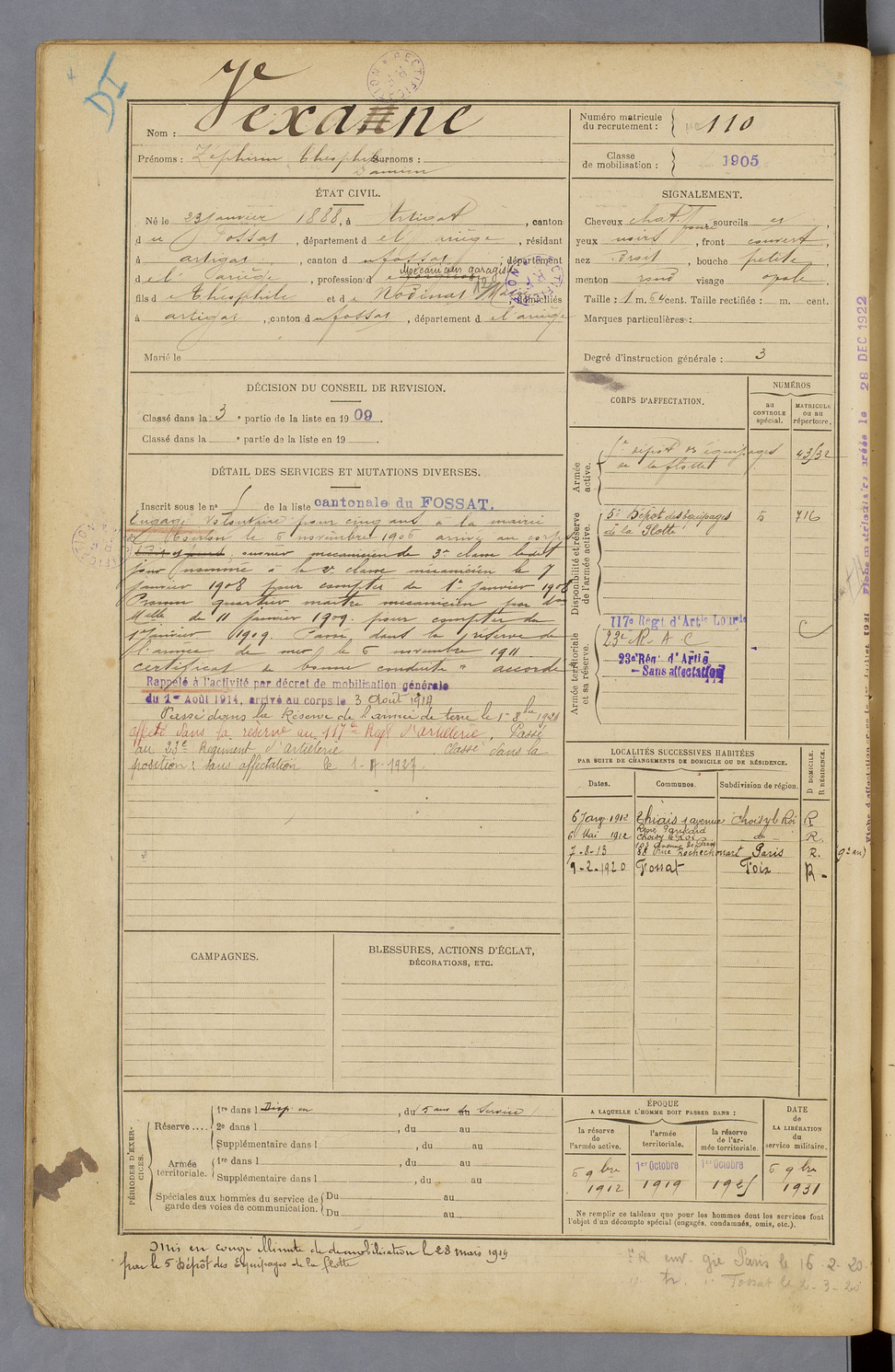 | Vexane | Zéphirin Théophile Damien | FOIX | 129 W 42 | 1908 | Artigat | Artigat | 110 |