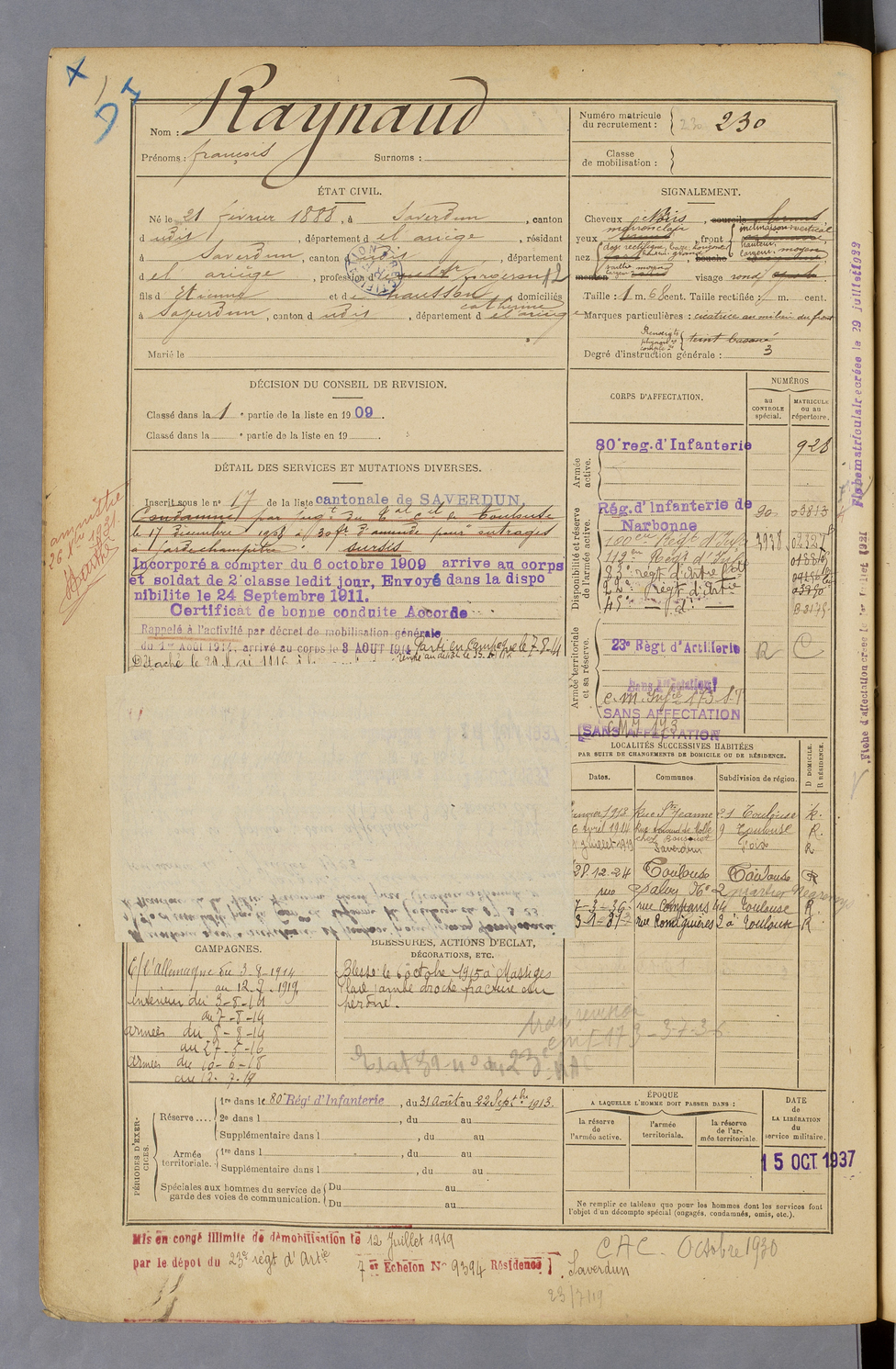 | Raymand | François | FOIX | 129 W 42 | 1908 | Saverdun | Saverdun | 230 |