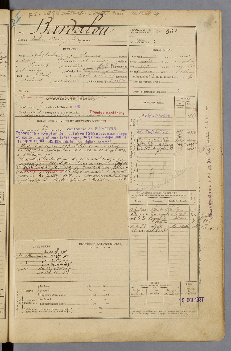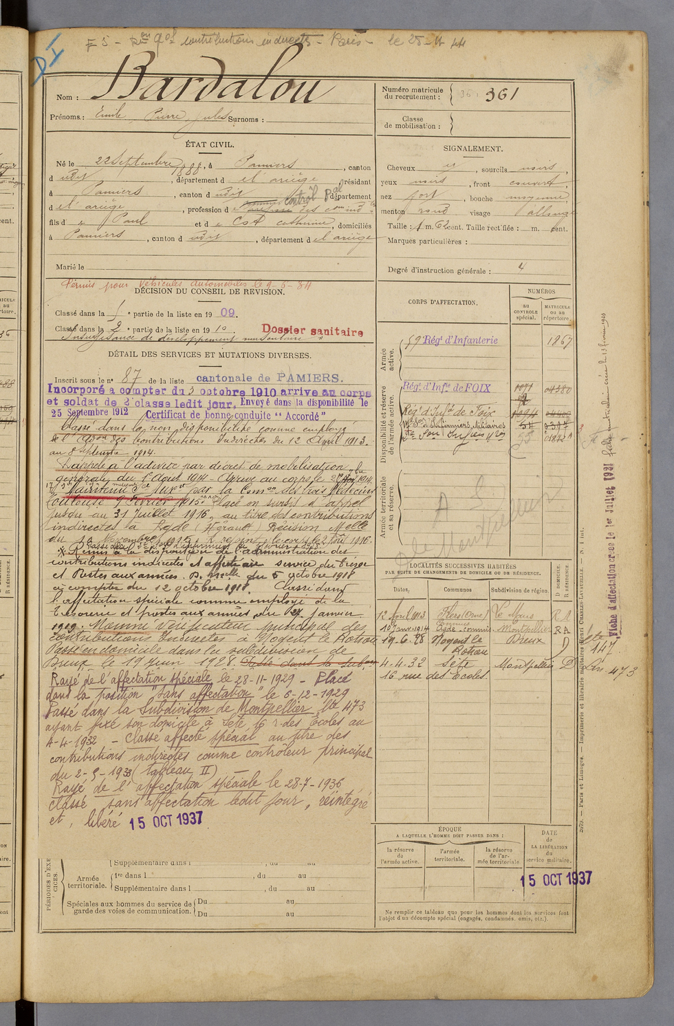 | Bardalou | Emile Pierre Jules | FOIX | 129 W 42 | 1908 | Pamiers | Pamiers | 361 |