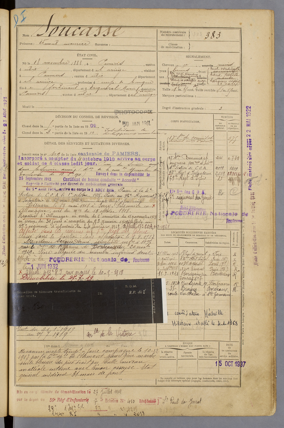 | Soucasse | Edmond Narcisse | FOIX | 129 W 42 | 1908 | Pamiers | Pamiers | 383 |