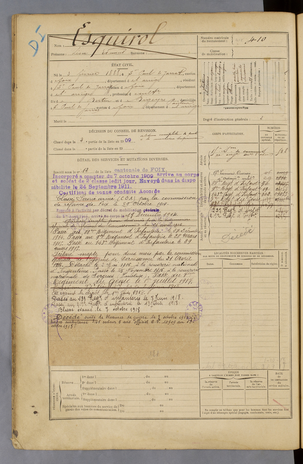 | Esquirol | Léon Edmond | FOIX | 129 W 42 | 1908 | Saint-Paul-de-Jarrat | Saint-Paul-de-Jarrat | 410 |
