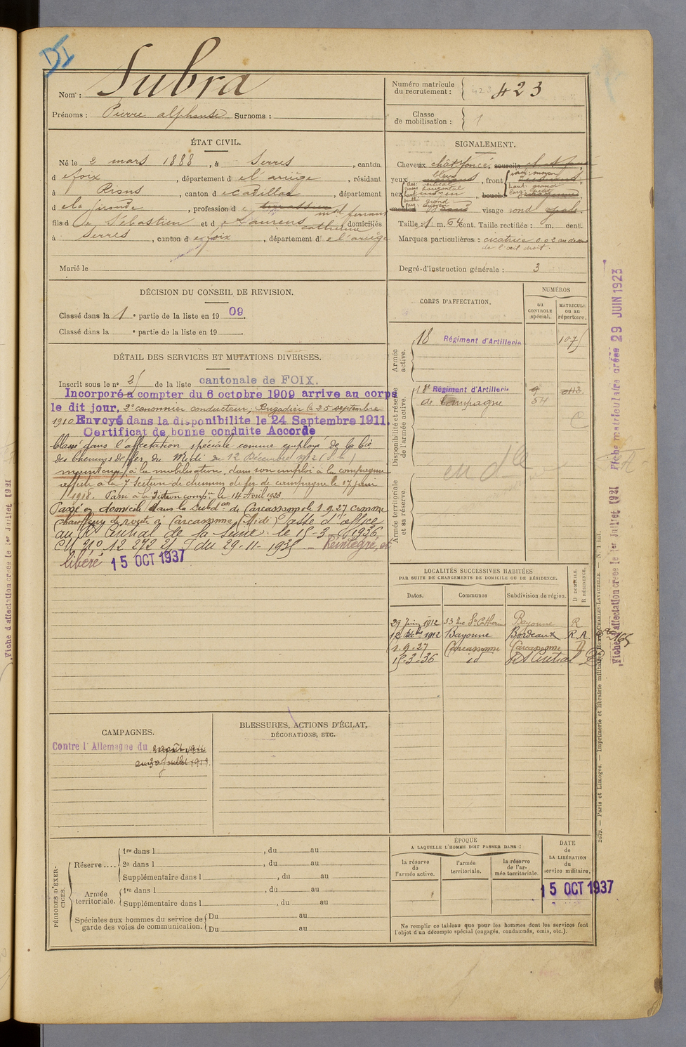| Subra | Pierre Alphonse | FOIX | 129 W 42 | 1908 | Serres-sur-Arget | Serres-sur-Arget | 423 |