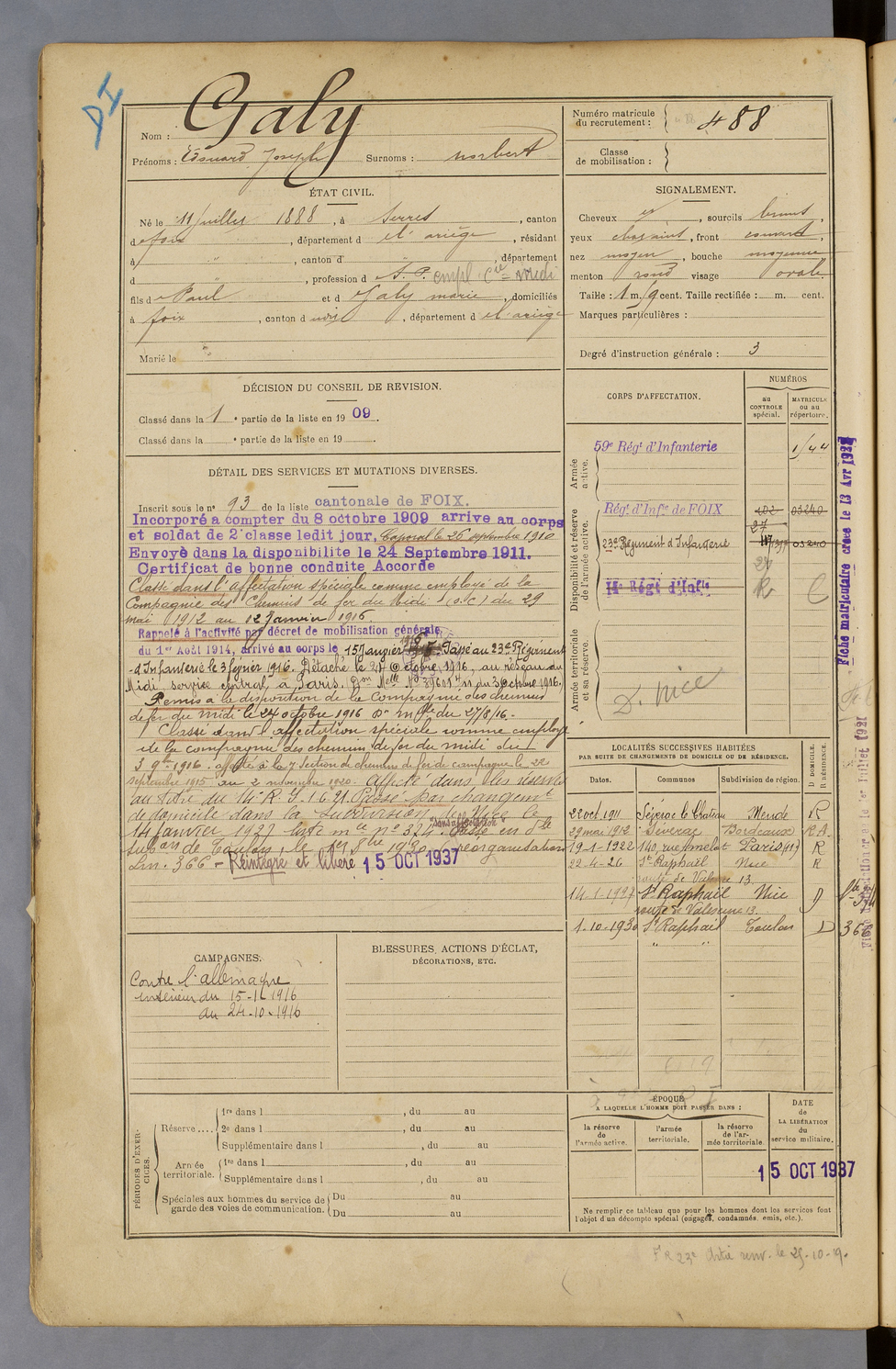 | Galy | Edouard Joseph dit Norbert | FOIX | 129 W 42 | 1908 | Serres-sur-Arget | 488 |