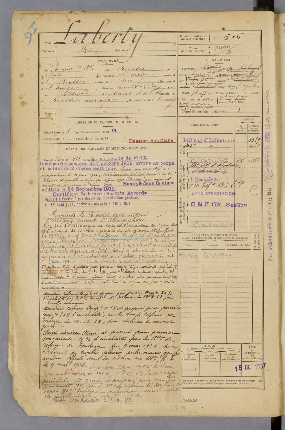 | Laberty | Elie | FOIX | 129 W 43 | 1908 | Brassac | Brassac | 506 |