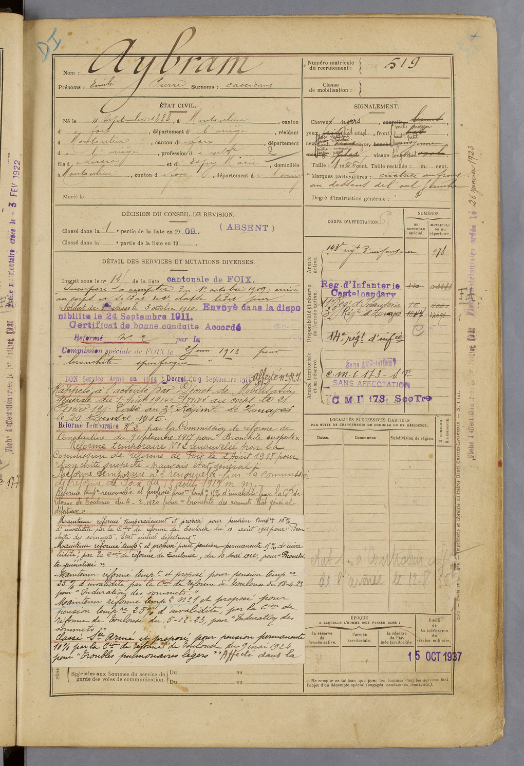 | Aybram | Emile Pierre dit Caccicaut | FOIX | 129 W 43 | 1908 | Montoulieu | Montoulieu | 519 |